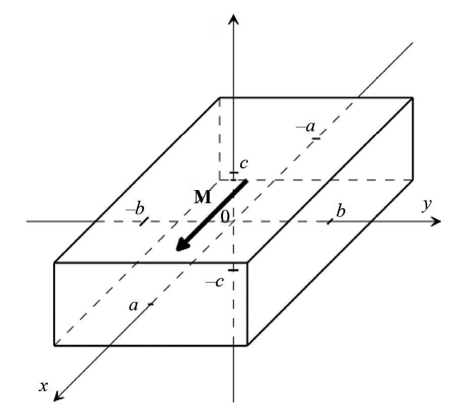 Однородно намагниченное тело в пространственной декартовой системе координат занимает область [–a, a] × [–b, b] × [–c, c] в форме прямого параллелепипеда. Намагниченность внутри тела постоянна и направлена вдоль оси х: M = {M, 0, 0}(см. рис. 1). Тогда вне поверхности тела напряженность результирующего магнитного поля H(r) ≡ H(x, y, z) = {Hx(x, y, z), Hy(x, y, z), Hz(x, y, z)} имеет вид: