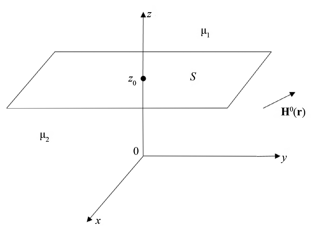 Пространство разделено плоскостью S на два однородных полупространства с различными магнитными проницаемостями μ1 и μ2 (см. рис. 2). Ось z декартовой системы координат перпендикулярна плоскости раздела S, уравнение которой z = z0. Внешнее поле с напряженностью во всем пространстве постоянно: Тогда результирующее поле H(r) = {Hx(r), Hy(r), Hz(r)} в каждом полупространстве тоже постоянно, причем в произвольной точке r = (x, y, z) ∉ S будет как для z < z0, так и z > z0, а