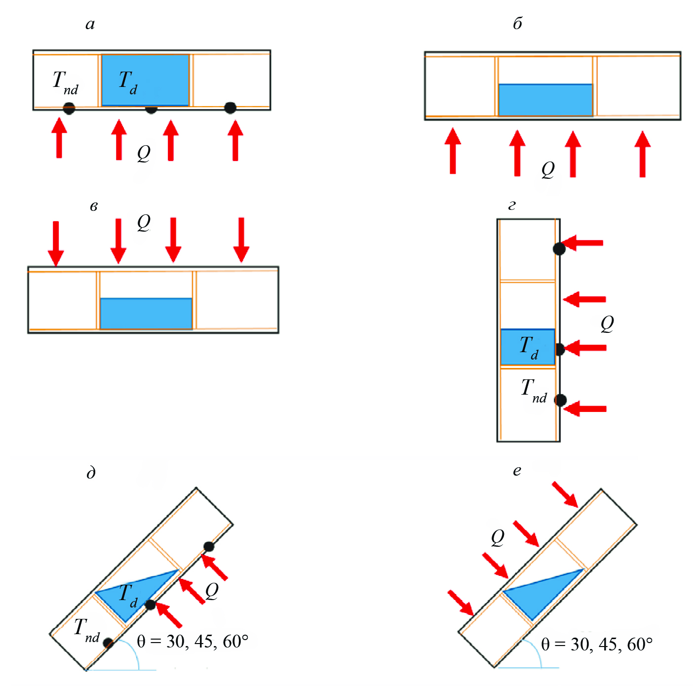 Ячейки сот могут быть полностью (рис. 2а) или частично (рис. 2б—д) заполнены водой (см. рис. 2а). На рис. 2 показаны ситуации, в которых ячейки сот заполнены водой на 50 и 100 %. В работе [11] было показано, что воду можно эффективно обнаруживать в ситуациях, когда она находится в контакте с обшивкой, и диагностика становится затруднительной, если между обшивкой и водой имеется воздушный промежуток. Следует заметить, что вода может в определенных положениях панели ускорять деградацию бумаги Nomex. В наклонном положении (см. рис. 2д, е) часть обшивки и часть ячейки находятся в контакте с водой под действием сил гравитации. Это приводит к тому, что температурные параметры обнаружения воды, такие как дифференциальный температурный сигнал ΔT, текущий контраст C = ΔT/Tnd (Tnd — избыточная температура объекта контроля в бездефектной области), а также оптимальные времена их наблюдения (tm (ΔT) и tm(C)), будут отличаться от случая горизонтальной панели с 50 %-м заполнением ячеек водой. Рассмотренные ниже модели включают ситуации НК воды в горизонтальном (см. рис. 2а—в), вертикальном (см. рис. 2г) и наклонном (см. рис. 2д, е) положениях сотовой панели.