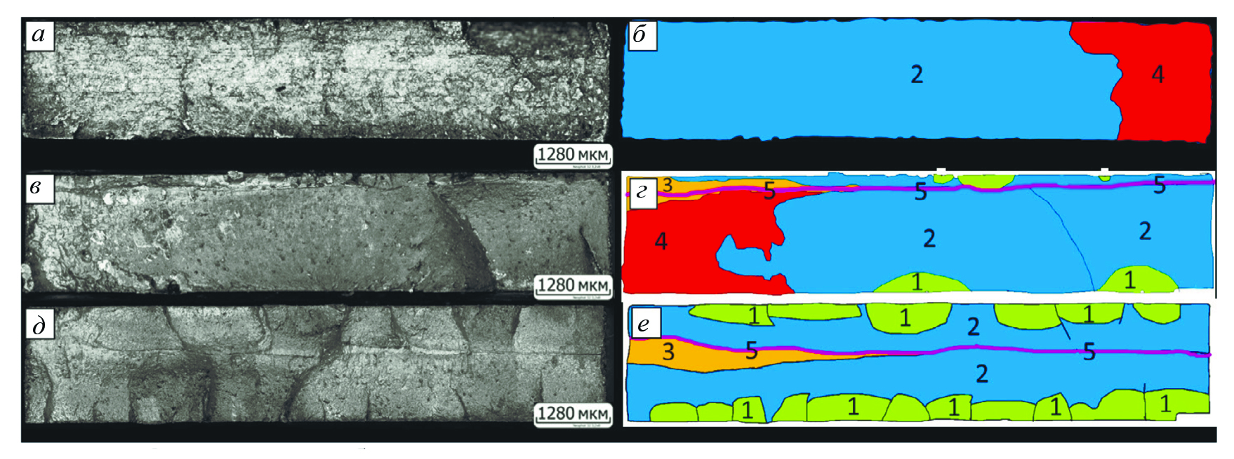 Рис. 2. Оптические изображения зоны изломов при одинаковых условиях нагружения образцов № 1 (а), № 2 (д) и № 3 (в), а также схемы зон усталостных изломов образцов № 1 (б), № 2 (е) и № 3 (г): 1 — очаг разрушения; 2 — зона стабильного роста трещин; 3 — зона ускоренного роста трещин; 4 — зона долома; 5 — гребень отрыва.