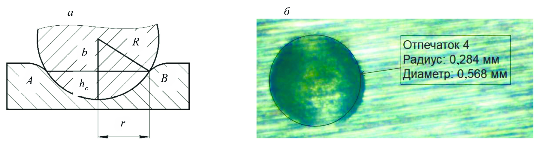 При оптическом расчете параметров ударно-контактного взаимодействия определение проекционной площади Ap и контактной глубины hc производится на основании отпечатка с помощью оптического микроскопа (рис. 2б). Предполагается, что хорда AB на рис. 2а является диаметром отпечатка, полученного при воздействии сферического индентора радиуса R с исследуемой поверхностью.