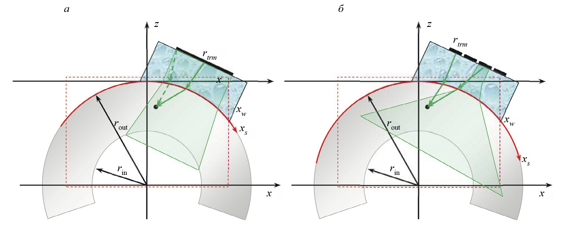 На рис. 1а схематически показан фрагмент толстостенной трубы с установленной на ее внешнюю поверхность антенной решетки с притертой призмой. Внешний диаметр трубы равен rout, а внутренний — rin. Положение призмы в плоскости xz определяется координатой xw вдоль оси xs, совпадающей с поверхностью трубы. Элементы антенной решетки и ось y расположены перпендикулярно плоскости рисунка. При такой ориентации антенной решетки изображение отражателей в плоскости xz в ОВИ, отмеченной на рис. 1а прямоугольником с пунктирной границей красного цвета, будет формироваться как при работе с обычным одноэлементным пьезопреобразователем, сканирующим вдоль окружности по оси xs, без учета специфики антенной решетки. По эхосигналам, измеренным в разных точках по оси xs, с помощью метода TFM можно сформировать изображение отражателей. При этом возникнет два эффекта. Во-первых, из-за выпуклой цилиндрической поверхности возникнет эффект фокусировки, эхосигналы будут регистрироваться на апертуре размерами около четверти длины окружности, которая схематически показана на рис. 1а утолщенной линией красного цвета. Во-вторых, отражатели будут находится в ближней зоне одного элемента антенной решетки, и это приведет к повышенному влиянию краевых волн [14, 15]. На рис. 1а путь распространения краевого импульса от левого края элемента антенной решетки показан двумя пунктирными стрелками зеленого цвета. На рис. 1 поле элемента антенной решетки и матрицы схематически показаны многоугольником с зеленой полупрозрачной заливкой. Отражатель будет находится в ближней зоне поля элемента антенной решетки, а дальнее поле элемента антенной матрицы может сформироваться уже в притертой призме, как показано на рис. 1б.