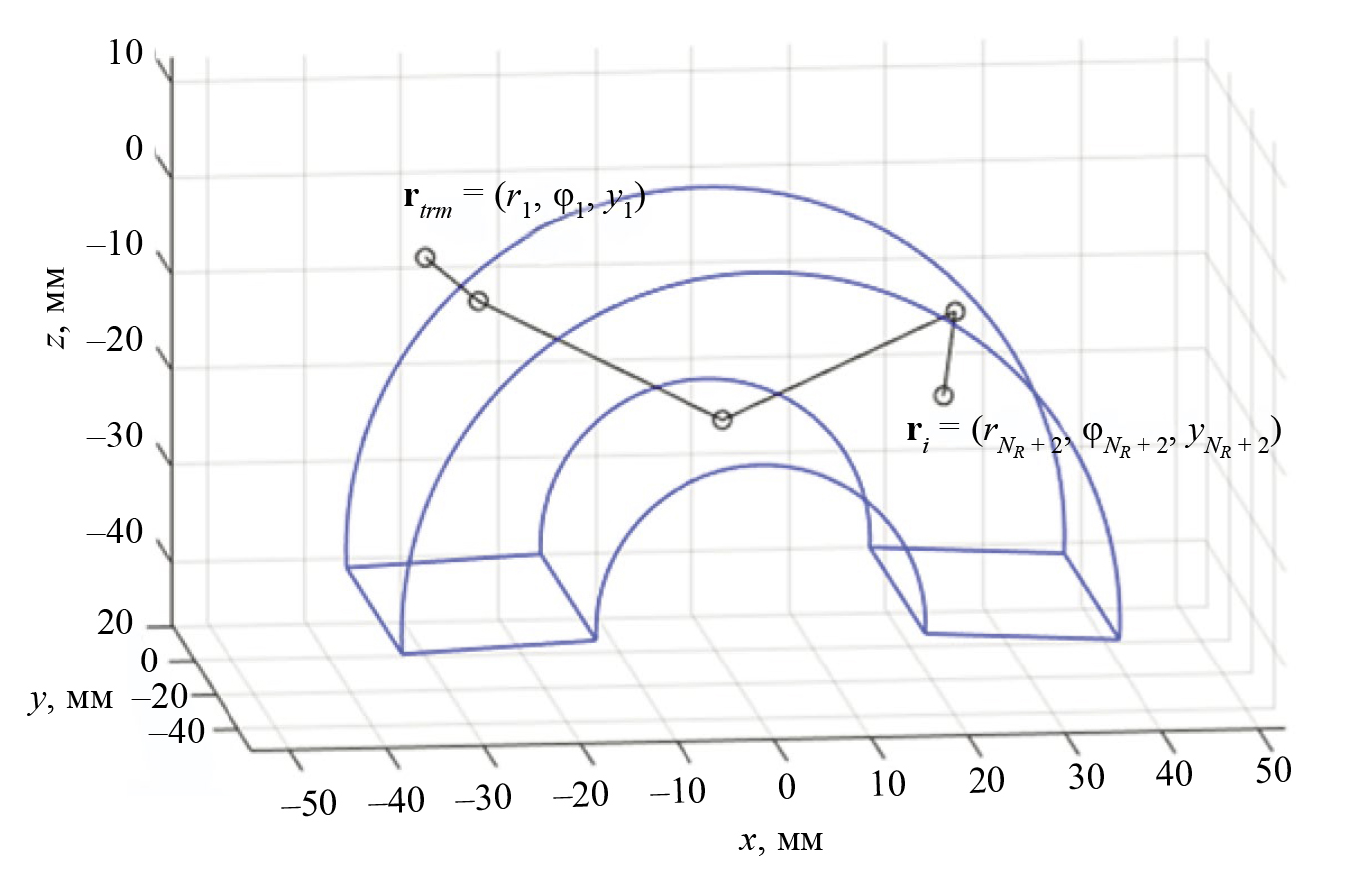 Пусть излучение происходит из точки rtrm = (r1, φ1, y1), координаты которой задаются в полярных координатах, а координаты точки ОВИ после отражений NR равны ri = (rNR+2, φNR+2, yNR+2) (рис. 2). Траектория луча описывается NR + 2 точками и состоит из NR + 1 прямых, скорость распространения звука на которых задана списком {c} = {cw,l, {cobj}}, где c1 = cw,l — скорость продольной волны в призме, а {cobj} — список, состоящий из произвольной последовательности скоростей продольной или поперечной волны в объекте контроля. У четных точек траектории первая координата приравнивается rin, а у нечетных точек — rout.