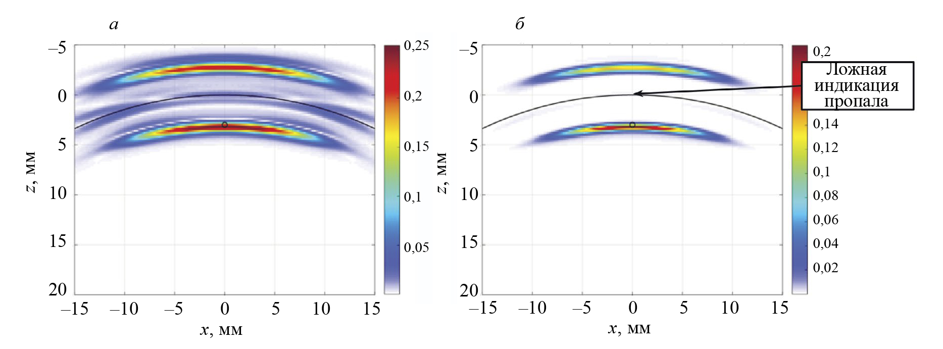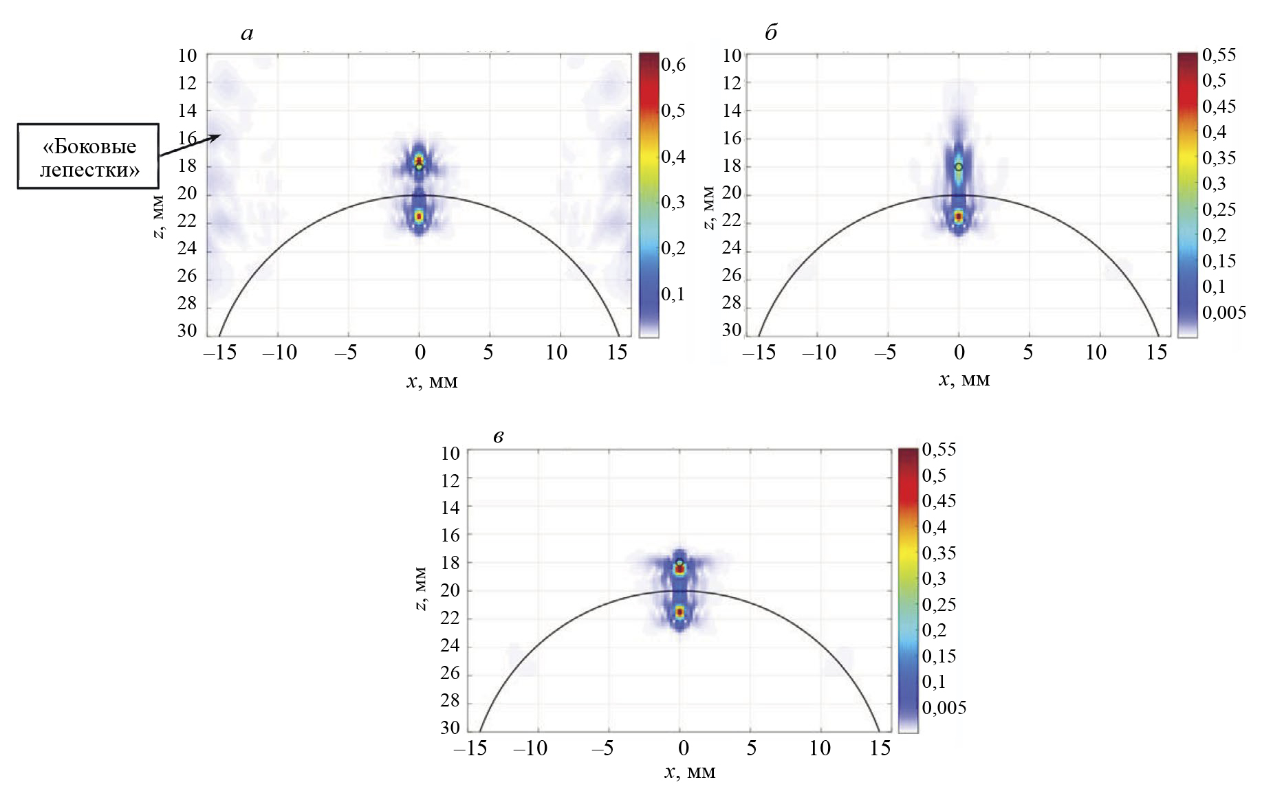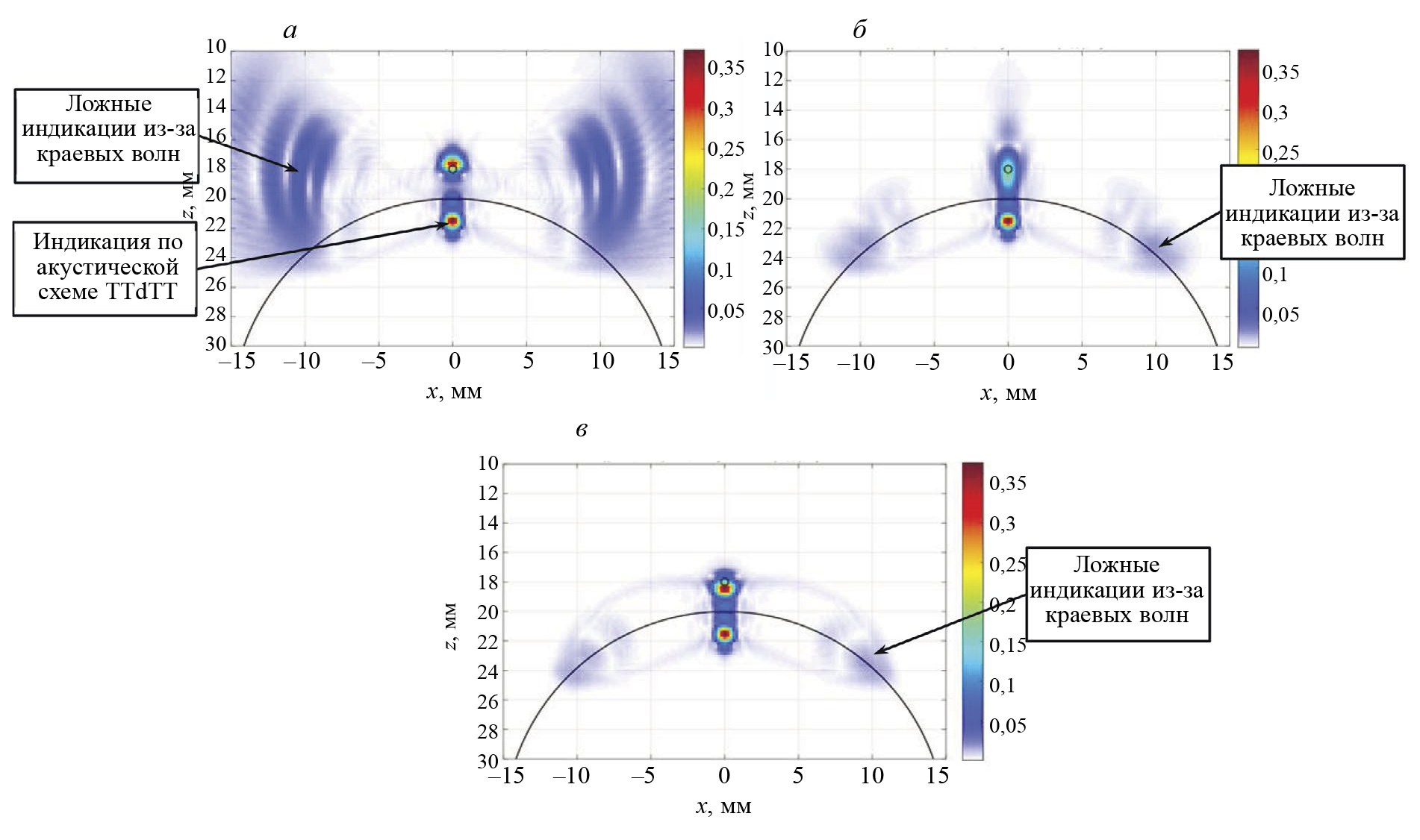 Эхосигналы рассчитывались для антенной решетки с частотой 5 МГц, состоящей из 16 элементов размерами 0,75×5 мм с зазором 0,25 мм, установленной на рексолитовую призму с углом наклона 35 град. Антенная решетка располагалась снаружи трубы, была ориентирована вдоль оси y и для повышения разрешающей способности в плоскости xz перемещалась по поверхности цилиндра (ось φ) 21 раз с шагом 2 град, начиная с –20 град (см. рис. 1а). По оси y антенная решетка перемещалась 6 раз с шагом 5 мм, начиная с положения –25 мм. На рис. 3 показаны ЦФА-изображения сферы, восстановленные по формулам (2) и (5) по акустическим схемам: TdT (а), TdTT (б), TTdTT (в). Оси на этих изображениях совпадают с показанными на рис. 1, а линией черного цвета показан внутренний диаметр трубы. На рис. 3а ложные индикации из-за наличия краевых волн имеют заметную амплитуду порядка –16 дБ от максимальной амплитуды индикации сферы. На изображениях, восстановленных на акустических схемах TdTT и TTdTT, ложные индикации из-за наличия краевых волн так же хорошо заметны. Из-за эффекта фокусировки разрешающая способность вдоль оси x достаточно высокая и равна примерно 1,5 мм. Отметим, что на плоскопараллельном объекте разрешающаяся способность ЦФА-изображения вдоль оси x была бы около 5 мм, что примерно соответствует размеру пьезопластины. Если бы расчеты проводились для типовых антенных решеток с размером элемента равным 0,75×10 мм, то разрешающая способность была бы около 10 мм. Изображения вне границ образца можно не восстанавливать, тогда не будет ложной индикации, сформированной эхосигналам по акустической схеме TTdTT.