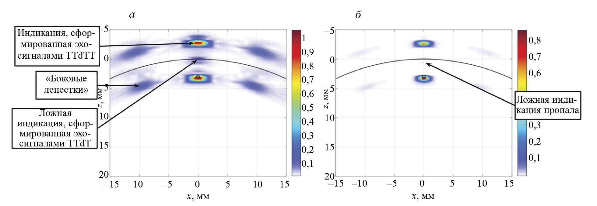 Рис. 8. ЦФА-изображение паза по акустической схеме TTdTT (а); ЦФА-CF-изображение с учетом когерентного фактора (б) при установке антенной матрицы со стороны ступеньки.