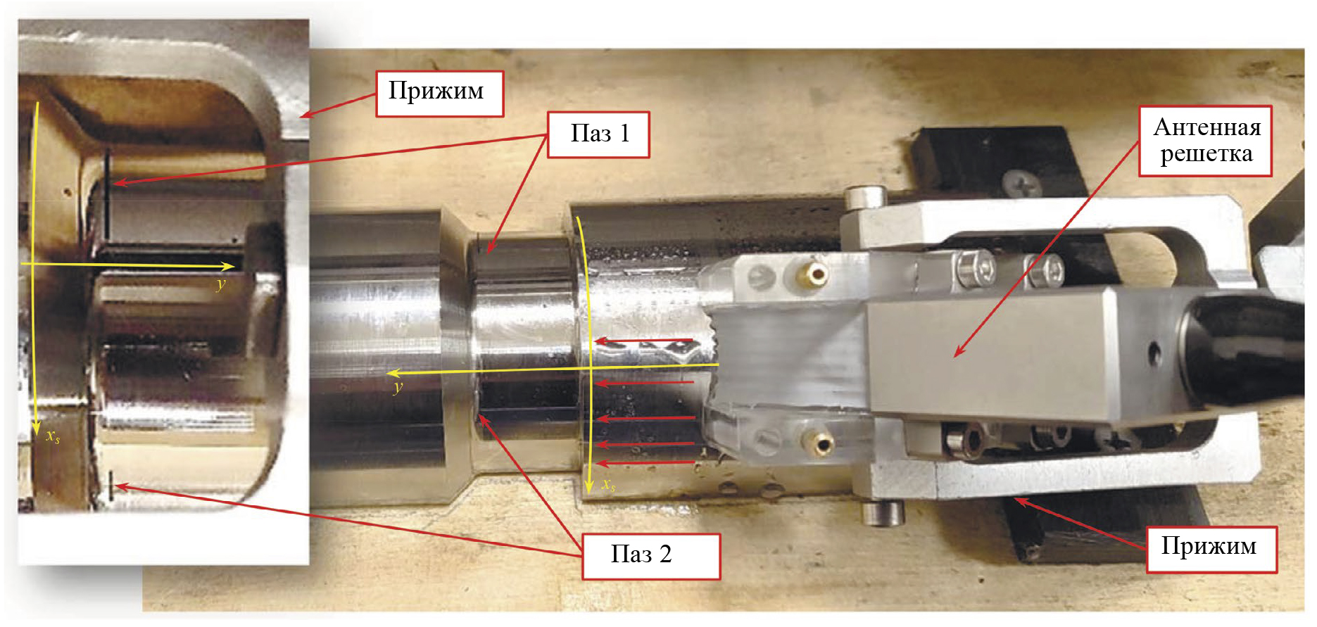 Рис. 7. Фотография толстостенной трубы, антенной решетки на призме, зажатой в прижим и расположенной со стороны ступеньки.
