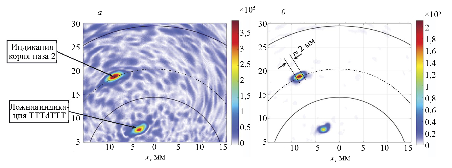 На рис. 8а показано ЦФА-изображение паза при размещении антенной матрицы со стороны ступеньки, как показано на рис. 7, восстановленное по формулам (2) и (5) по акустической схеме TTdTT, а на рис. 8б показано ЦФА-CF-изображение с учетом когерентного фактора, восстановленное по формулам (4) и (5). Для повышения разрешающей способности антенная решетка перемещалась по поверхности цилиндра (ось xs) по пяти положениям, показанными стрелками красного цвета. Координата y была зафиксирована и равна 0 мм. На изображения сплошными линиями черного цвета нанесены границы внутренней и внешней поверхности, а пунктирной линией черного цвета показана цилиндрическая проточка диаметром около 20 мм. На обоих изображениях хорошо обнаруживается индикация корня трещины. Но на ЦФА-CF-изображении отношение сигнал/шум увеличилось более чем на 12 дБ, а возросшая разрешающая способность позволяет оценить размеры трещины примерно как 2 мм. Изображения вне границ образца можно не восстанавливать и тогда не будет ложной индикации, сформированной эхосигналам по акустической схеме TTTdTTT.