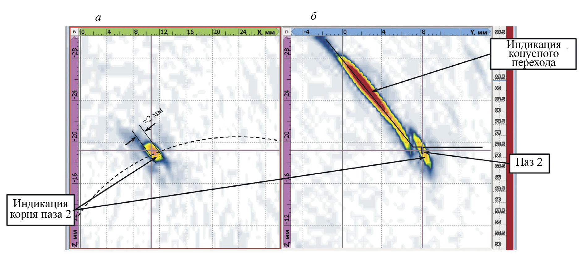 Рис. 9. ЦФА-изображение паза по акустической схеме TTdTT при установке матрицы со стороны конуса: вид B-типа (а); вид D-типа (б).