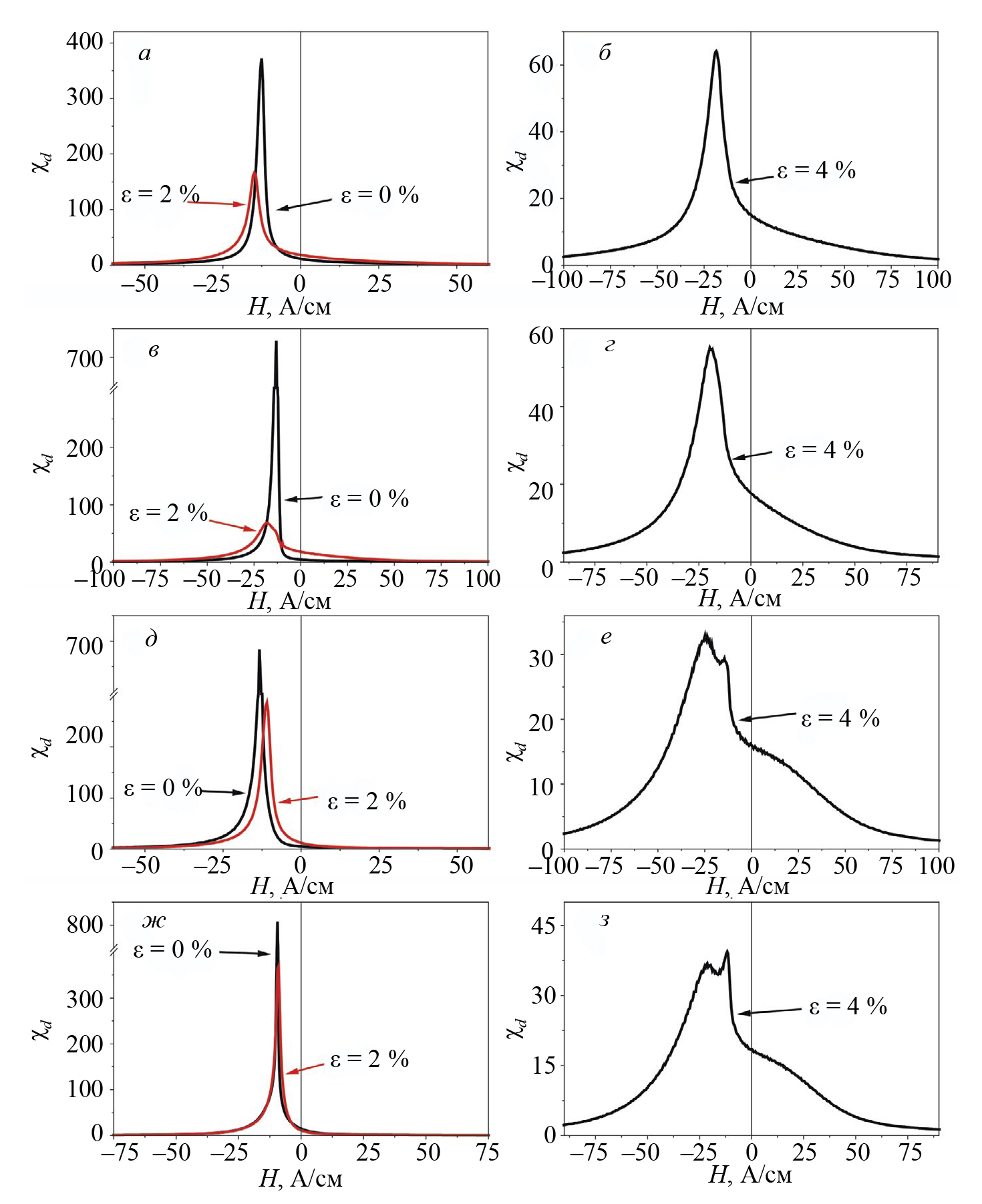 На рис. 2 приведены полевые зависимости дифференциальной магнитной восприимчивости χd(H) для недеформированных и пластически деформированных образцов из стали 38ХС. Кривые χd(H) для недеформированных закаленных и отпущенных образцов имеют единственный максимум в районе коэрцитивной силы. Пластическая деформация приводит к кардинальному изменению кривых. Из рис. 2 видно, что для образцов с удлинением 2 % хотя и визуально различим единственный максимум, его амплитуда становится существенно меньше и наблюдается его уширение. Наиболее выраженно это происходит для образца с Тотп = 600 °С (см. рис. 2в). Еще более явные отличия на кривых χd(H) наблюдаются для образцов с удлинением 4 %: для образцов с температурами отпуска 500 °С (см. рис. 2б) и 600 °С (см. рис. 2г) происходит еще большее уширение единственного пика, а для образцов с Тотп = 650 °С (см. рис. 2е) и Тотп = 700 °С (см. рис. 2з) на кривых появляется еще один максимум слева от основного и перегиб в положительном поле. Появление перегиба и дополнительного пика указывает на наличие в образцах магнитной текстуры типа «легкая плоскость», вызванной деформацией [7].