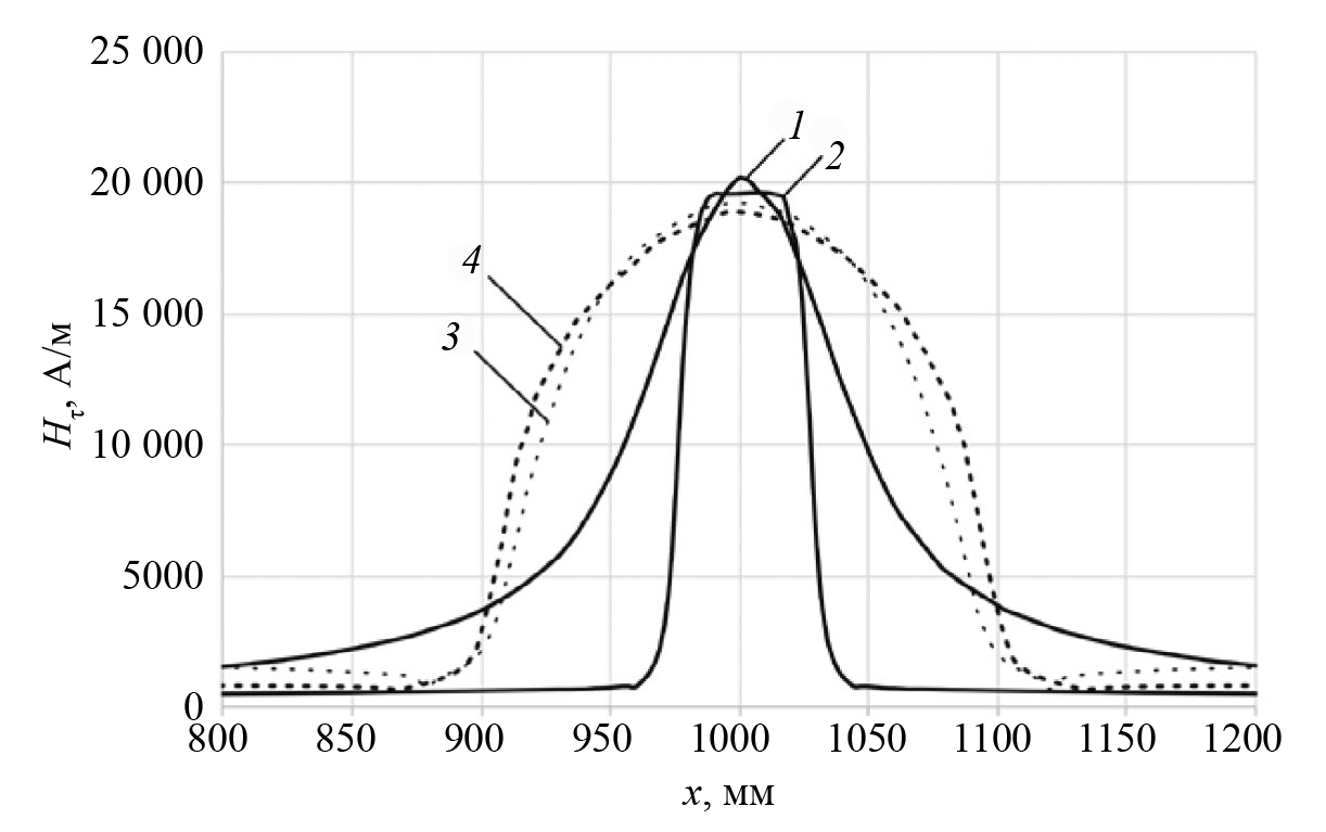Рис. 3. Распределение тангенциальной составляющей напряженности магнитного поля на поверхности трубы вдоль ее оси от намагничивающих систем: 1 — катушки; 2 — распашной с постоянными магнитами; 3 — распашной с воздушным зазором; 4 — распашной с ферромагнитными колесами.