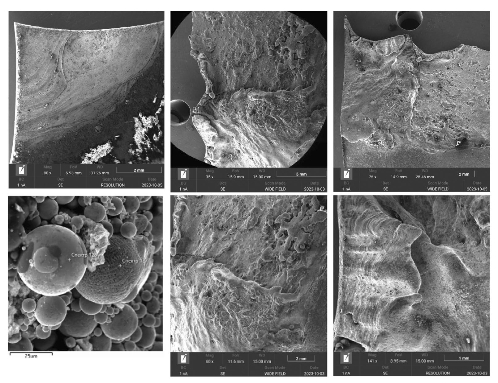 Электронно-микроскопический анализ показал, что на внешней поверхности трубопровода в кратере дефектов присутствуют множественные очаги оплавления металла, для которых характерны плавные линии внешних контуров, отдельные сформированные капли металла, напоминающие брызги (рис. 3). На внутренней поверхности трубопровода подобных явлений не наблюдается, что свидетельствует о высокотемпературном точечном воздействии именно на внешнюю поверхность трубы.