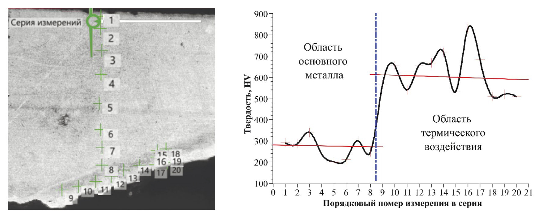 Рис. 4. Результаты измерения микротвердости для образца с дефектом.