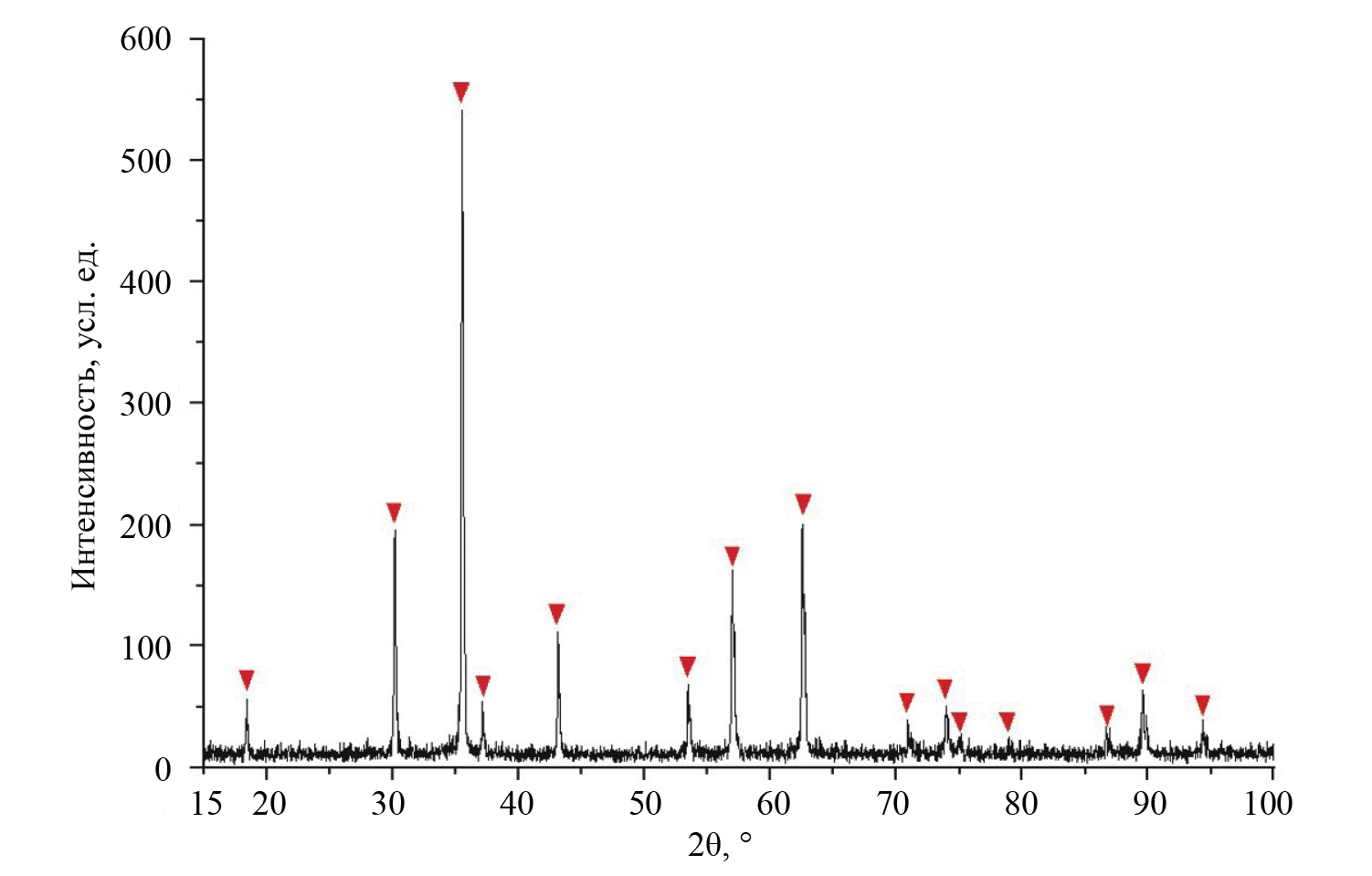 Рис. 4. Рентгенограмма никель-цинкового образца (▼ – рефлексы, соответствующие фазе Ni0.4Zn0.6Fe2O4)