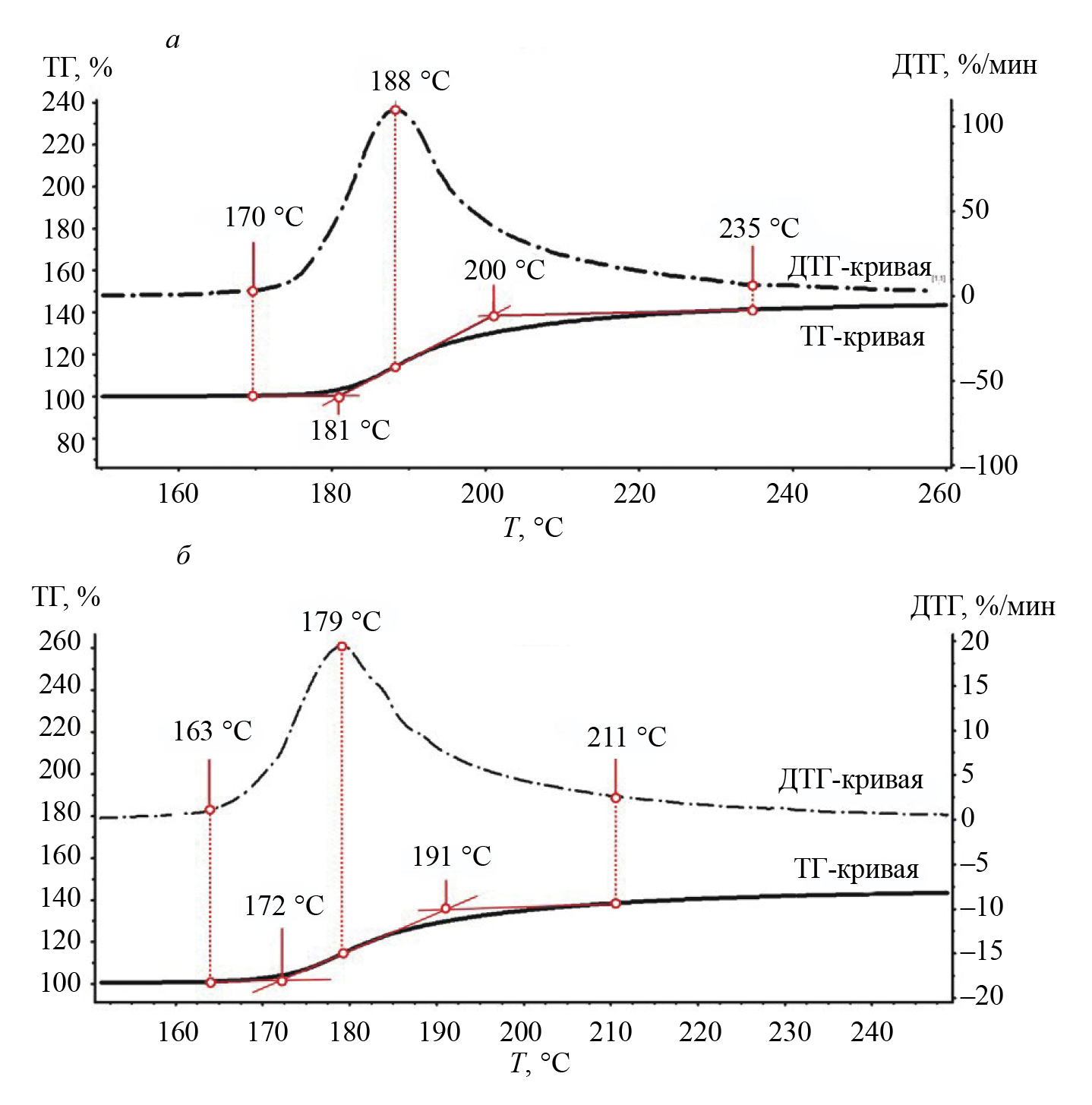 Как правило, в качестве точки Кюри принимается температура, соответствующая максимуму ДТГ-кривой [23—26], однако в ряде работ используется иной математический аппарат для обработки экспериментальных данных. Например, в [29] находили точку пересечения касательных, проведенных по фронту ТГ-сигнала и по участку кривой после магнитного фазового перехода. В настоящей работе представлено несколько наиболее распространенных температурных характеристик переходного процесса. Так, для термограммы, полученной на стадии нагрева, можно выделить следующие температурные характеристики: 170—235 °С — температурный диапазон, при котором наблюдалось изменение веса образца (ненулевой ДТГ-сигнал); 181 и 200 °С — температурные координаты точек пересечения касательной, проведенной к фронту ТГ-кривой, и касательных, построенных для участков до и после магнитного фазового перехода соответственно; 188 °С — температура, соответствующая максимальной скорости изменения веса образца (пик ДТГ-сигнала). При этом характеристики магнитного фазового перехода, полученные на стадии охлаждения, находятся в области более низких температур. Наличие определенной инерционности при протекании магнитных фазовых превращений типа «ферримагнетик ⇄ парамагнетик» было ранее продемонстрировано в [26].