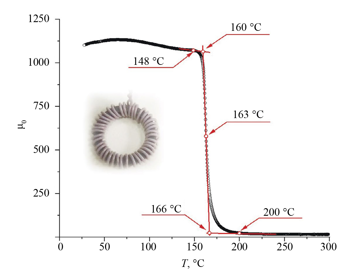 Температурная зависимость начальной магнитной проницаемости показана на рис. 6. Изменение магнитной проницаемости наблюдалось в диапазоне температур 148—200 °С; точка перегиба графика µ0(T) соответствует температуре 163 °С; температурные координаты точек пересечения касательной, проведенной к точке перегиба, и касательных, построенных для стационарных участков кривой, равны 160 и 166 °С.