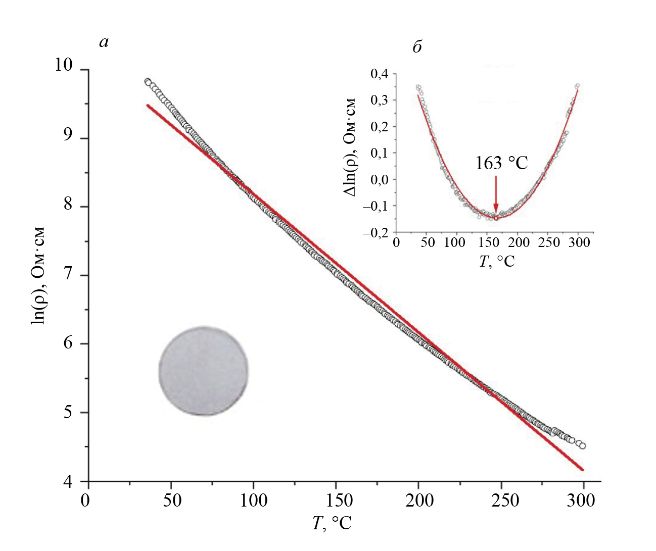 Температурные измерения передавались на компьютер с термопары измерительной ячейки через электронный термометр. Это позволило получить необходимые температурные зависимости удельного электрического сопротивления феррита для их последующего анализа. Измерения проводились на стадии нагрева образца от комнатной температуры до 300 °С.