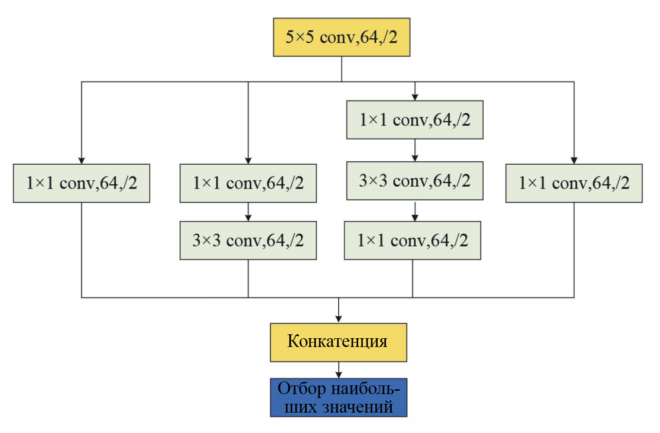 Новая модель под названием SLConNet разработана путем модификации модели ResNet. Модификации включают в себя добавление одного начального модуля после входного слоя и улучшение каждого остаточного блока. Начальный модуль состоит из одного сверточного ядра 5×5, двух сверточных ядер 3×3 и пяти сверточных ядер 1×1 (рис. 4). Каждый остаточный блок модифицируется путем вставки одного масштабирующего слоя на остаточную функцию, остаточную связь и после выхода остаточного блока (рис. 5). Полная структура модели SLConNet показана на рис. 3. На входной слой поступают RGB-изображения размером 224×244 пикселя.