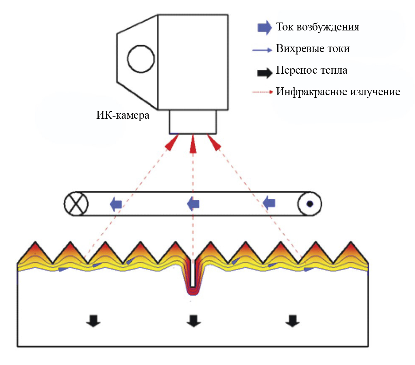 где T = T(x, y, z, t) — распределение температуры; k — теплопроводность материала; ρ — плотность; сp — изобарная теплоемкость; q(x, y, z, t) — функция внутреннего теплового потока в единицу объема. В ходе процедуры по контролю дефектов трещины на резьбовой поверхности перераспределяют вихревые токи и потоки тепла. Это приводит к различным распределениям температуры на резьбовых поверхностях, которые могут зафиксированы с помощью инфракрасной (ИК) камеры.