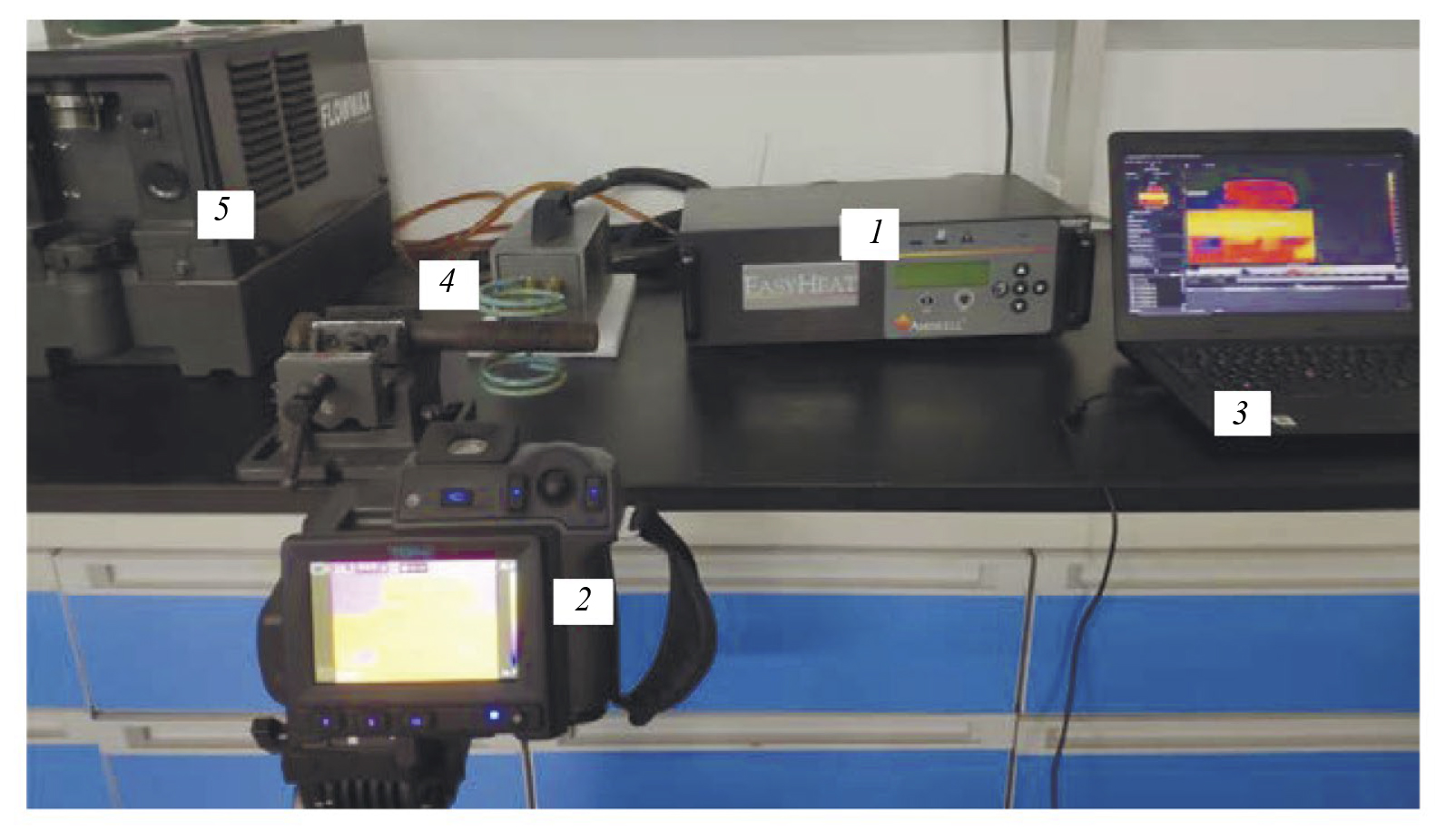 Экспериментальная установка представлена на рис. 2. Она включает в себя систему индукционного нагрева (EasyHeat 0224), ИК-камеру (FLIR-T630sc) и компьютер. Система индукционного нагрева обеспечивает максимальную мощность нагрева 2,4 кВт, ток высокой частоты в диапазоне частот от 150 до 400 кГц, действующее значение максимального возможного тока возбуждения составило 400 А. ИК-камера регистрирует изменение температуры резьбовой поверхности с частотой 30 Гц и генерирует термограммы с разрешением 640×480 пикселей. Чувствительность и точность ИК-камеры составляют 30 мК и ±2 % соответственно.