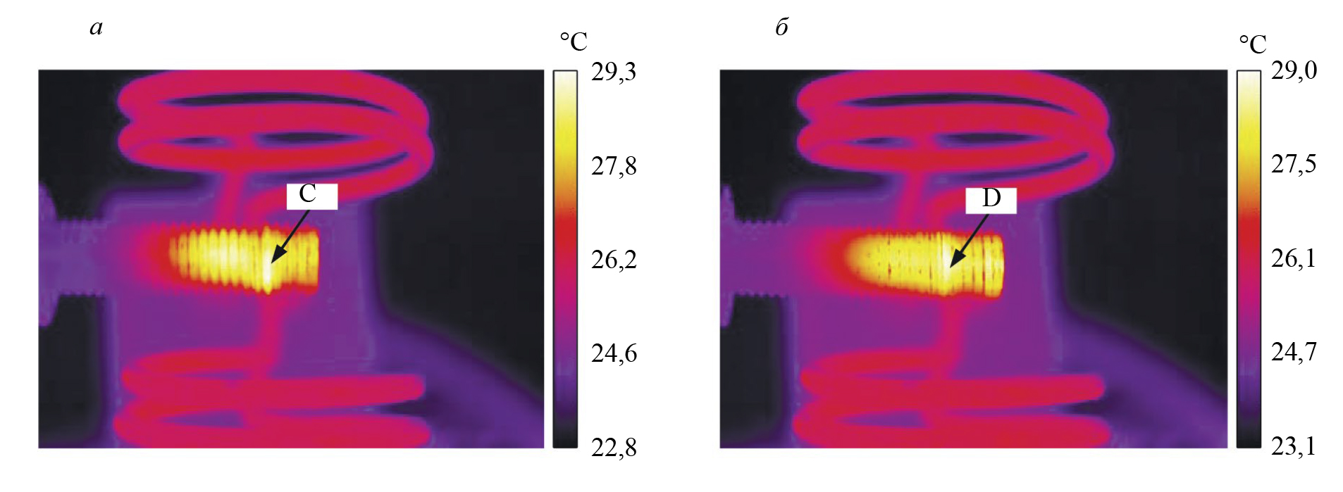 Для болтов C и D ток возбуждения и длительность возбуждения были заданы равными 220 А и 300 мс. На рис. 6 представлены термограммы трещин C и D, снятые через 0,3 с. Из рис. 6 видно, что в течение периода возбуждения распределение температуры на поверхности резьбы хорошо согласуется с выводами, полученными в результате теоретического анализа. Высокие и низкие температуры чередуются вдоль оси резьбовой части. Выступы резьбы представляют собой высокотемпературные области, а впадины резьбы — низкотемпературные. Видно, что хотя трещины C и D не могут быть четко идентифицированы, они все же демонстрируют более высокие температурные показатели по сравнению с окружающей зоной контроля.