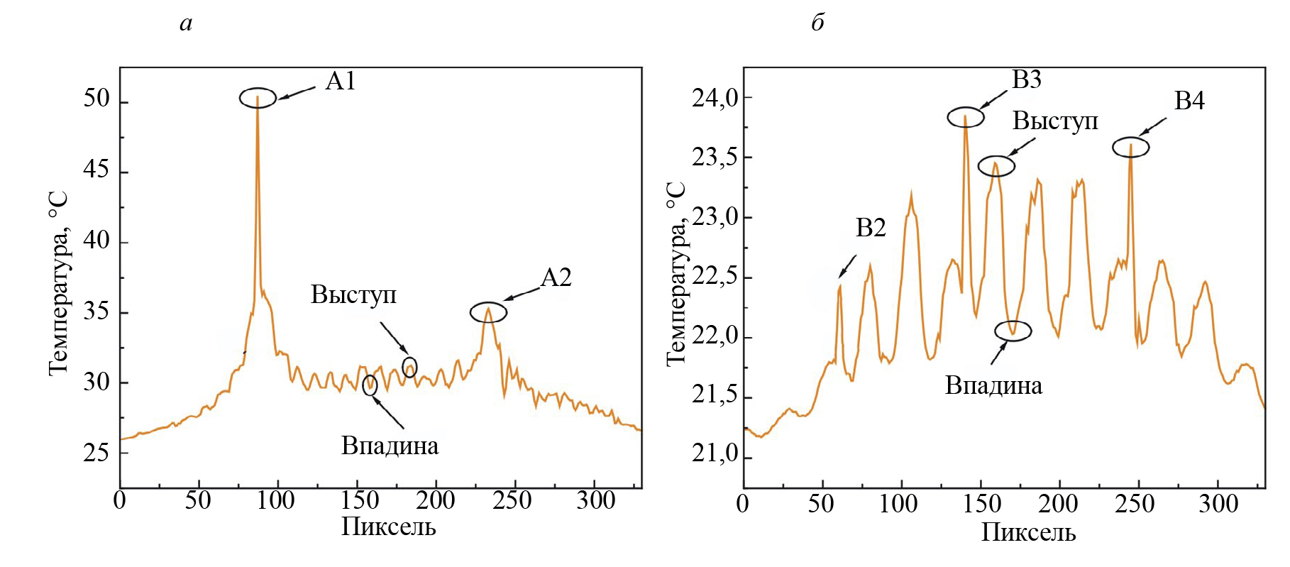 Рис. 7. Профиль температуры вдоль отмеченной линии для дефектов A1 и A2 (a); B2, B3 и B4 (б)