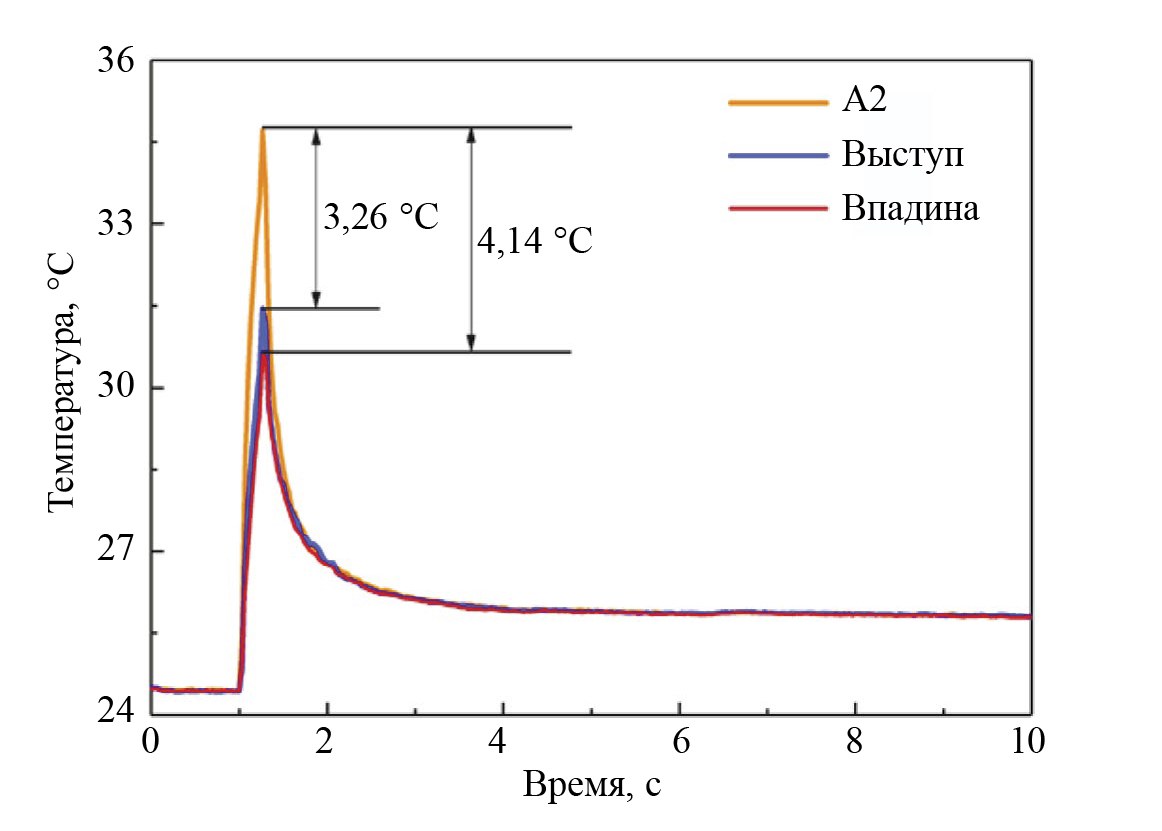 Динамика изменения температуры в характерном месте на резьбовой поверхности болта А показана на рис. 8. Эти графики показывают изменение температуры с течением времени в области выступа резьбы, впадины резьбы и трещины соответственно. Можно заметить, что температуры имеют одинаковую тенденцию в течение всей процедуры контроля, но имеют разные пиковые значения. Все температуры продолжают расти в течение периода возбуждения, пока не достигнут пиковых значений примерно в конце возбуждения. Разница пиковых температур между областью трещины и выступом составляет 3,26 °С. Максимальная температура впадины резьбы меньше, чем температура области трещины на 4,14 °С. Эта разница температур заметна на термограммах, что достаточно для явного указания на наличие трещин.