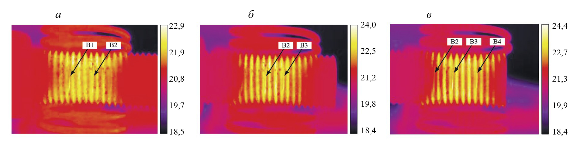 Рис. 10. Термограммы болта B при различных расположениях катушек