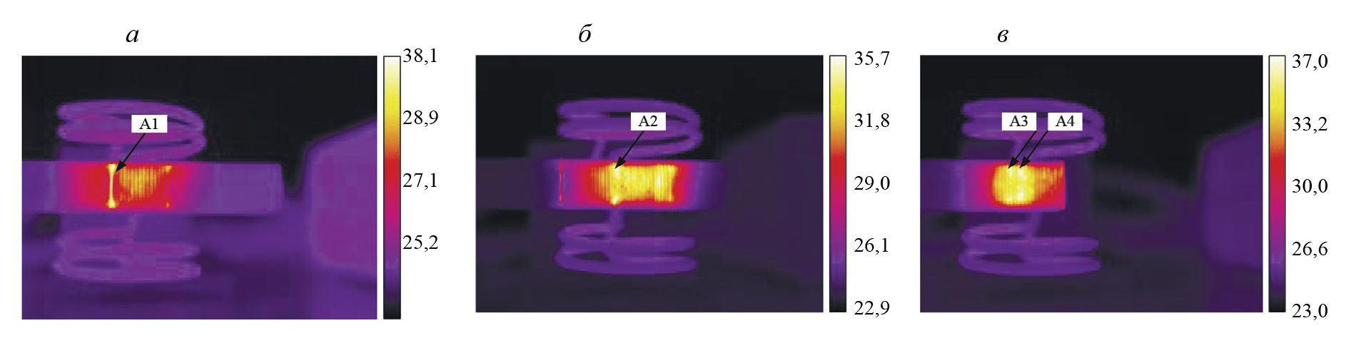 Во время проведения исследования методом ЭМТ для болта А ток возбуждения и длительность возбуждения были установлены равными 220 А и 300 мс. На рис. 4 представлены термограммы трещин A1, A2, A3 и A4, снятые через 0,3 с. Из рис. 4 видно, что резьбовая поверхность не демонстрирует явных признаков чередования высоких и низких температур из-за малого шага резьбы болта А. На рис. 4a можно четко определить наличие трещины A1. Наличие трещины приводит к появлению сильных искажений индуцированного вихревого тока, в результате чего в месте трещины возникает большое количество вихревого тока, что приводит к выделению большего количества джоулева тепла в месте трещины. Характер воздействия высокой температуры на трещину A2 не является очевидным по сравнению с трещиной A1. Трещины A3 и A4 на рис. 4б трудно различимы из-за меньшего размера дефекта.