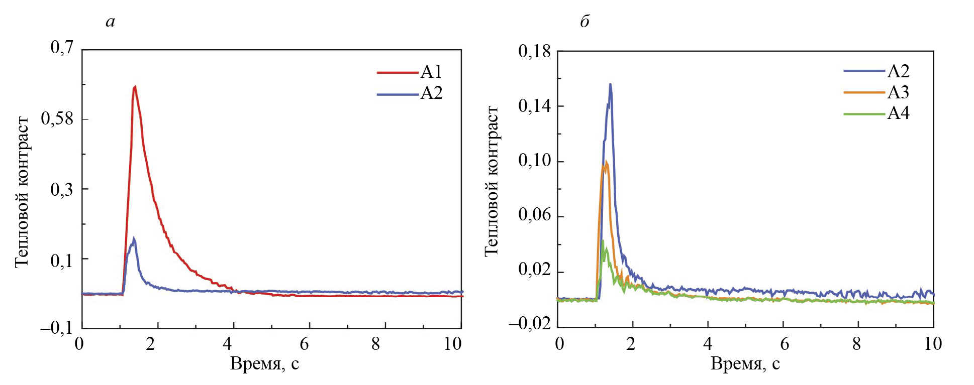 Температурные данные о трещинах A1—A4 получаются отдельно для дальнейшего количественного анализа характерных различий трещин разного размера. Были выбраны две репрезентативные точки в области трещин и в бездефектной области для исследования коэффициента теплового контраста. Как было описано ранее, трещины A1 и A2 имеют одинаковую глубину 4 мм, но разную ширину (0,5 и 0,2 мм соответственно). Трещины A2, A3 и A4 имеют одинаковую ширину 0,2 мм, но разную глубину, которая составляет 4, 3 и 2 мм соответственно. Для трещин A1 и A2, которые имеют одинаковую глубину, но разную ширину, мы можем визуально определить, что более широкая трещина A1 показана более отчетливо, чем трещина A2 на рис. 14a. Для трещин A2, A3 и A4, которые имеют одинаковую ширину, но разную глубину, мы видим, что с увеличением глубины трещин трещины отображаются более отчетливо на полученных термограммах.