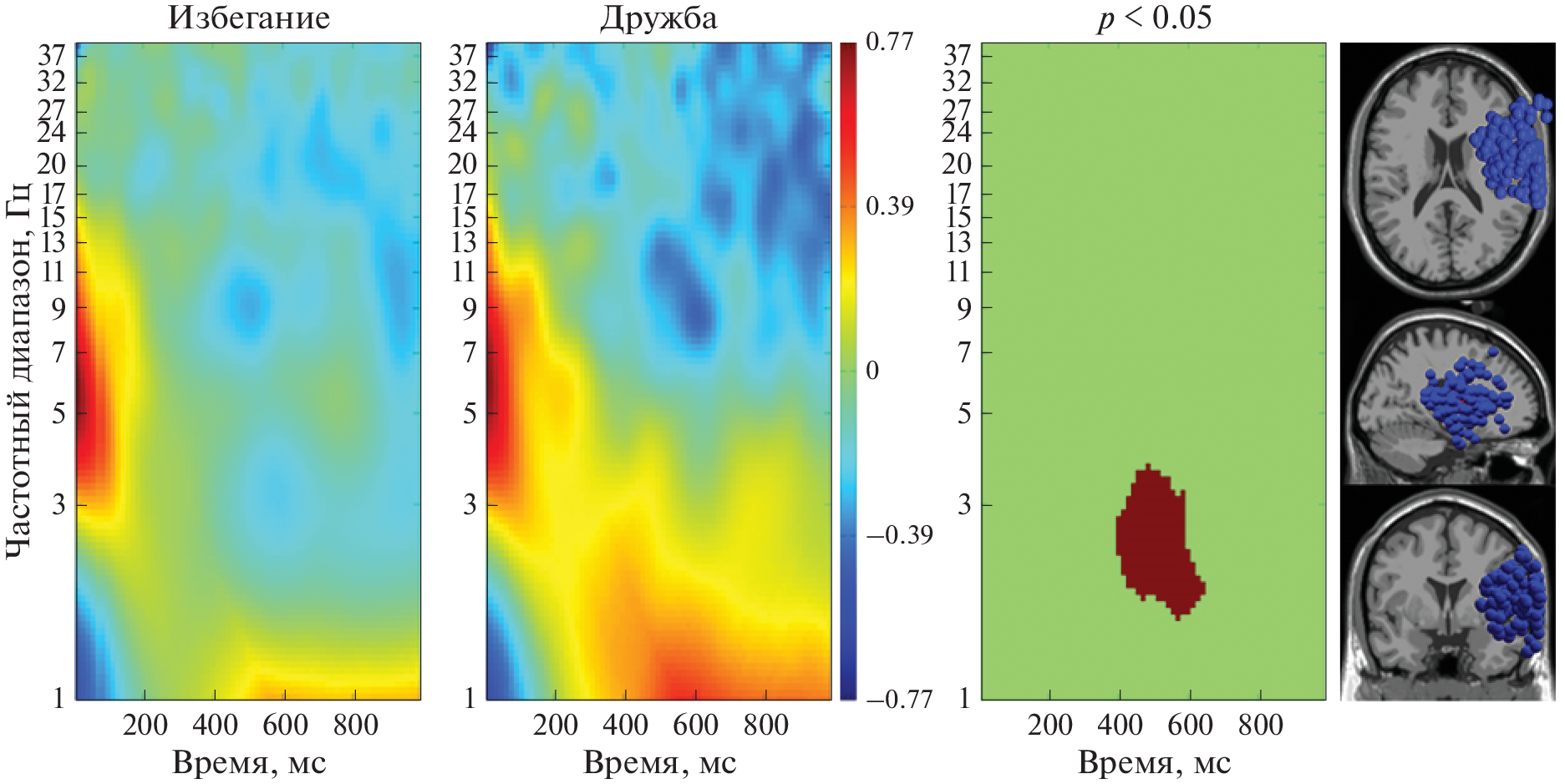 The aim was to study the oscillatory dynamics accompanying the processes of interaction with the virtual character and the localization of the revealed effects. 42 subjects (of which 25 are women) aged 18 to 41 years took part in the study. During the EEG recording, the subjects had to interact with the virtual character by choosing one of three options (“offer friendship”, “attack” or “avoid contact”). Faces with 5 types of emotional expressions (angry, happy, frightened, sad and neutral) were used. An analysis of equivalent dipoles revealed that the choice of active interaction (to attack or offer friendship), compared with the avoidance of interaction, was accompanied by a large decrease in α- and β-rhythms, which may be associated with the processes of understanding the virtual character’s intentions. The choice of friendship versus avoidance of interaction was accompanied by an increase in δ-rhythm, which may indicate the presence of a motivational component. The revealed effects were found in clusters of equivalent dipoles, the localization of which coincides with the structures of the mentalization network and the network of mirror neurons involved in the processes of people’s intent assessment.
