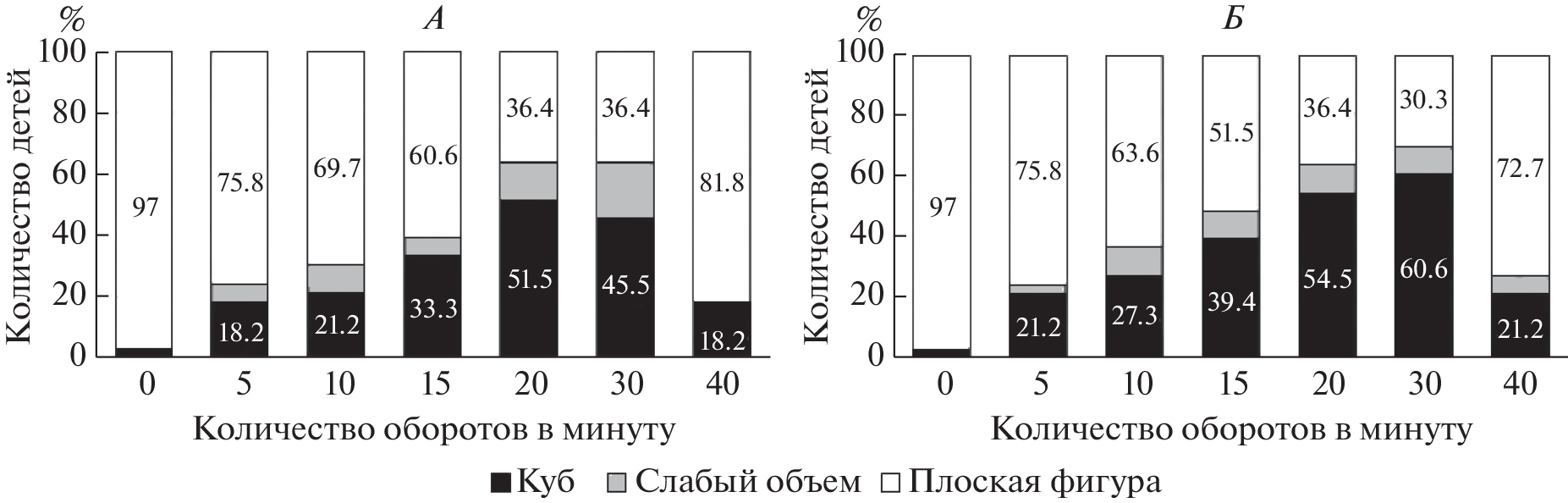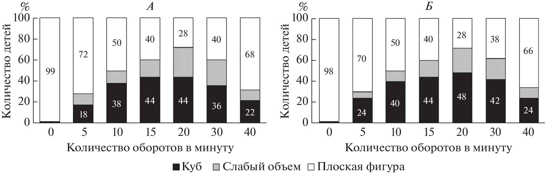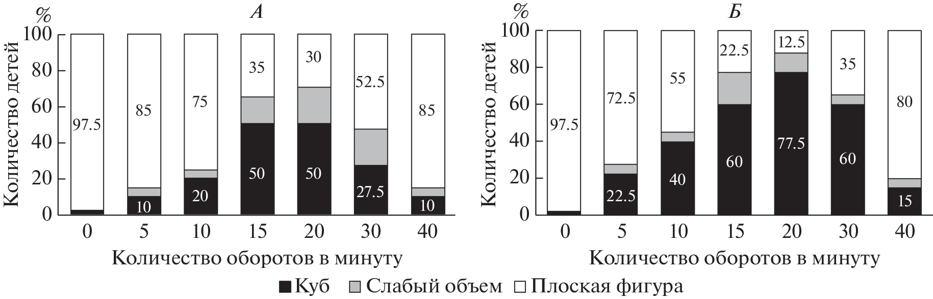 Manifestations of the illusion of a three-dimensional structure appearing when rotating a flat projection of a three-dimensional object (structure from motion (SfM)) were studied in three groups of children aged 7 to 17 years: 1) 40 children of the control group with orthotropy, the normal state of visual functions (including binocular and stereovision) and fundus; 2) 33 children with non-paralytic strabismus and normal fundus condition; 3) 50 children with non-paralytic strabismus on the background of congenital partial atrophy of the optic nerve (PAON). As a test image, we used the figure of a hexagon with diagonals passing through its center, presented in binocular and monocular observation conditions in the form of a still image, and when it rotates at a speed of 5, 10, 15, 20, 30, 40 rpm. It was shown that the perception of a three-dimensional structure in the form of a cube is possible with a stationary presentation of a test image in 2–3% of children of both the control group and groups of children with strabismus in binocular and monocular observation conditions. When rotating the test image in both binocular and monocular observation conditions, the number of children who perceived the cube in all groups increased with increasing image rotation speed, reached maximum values at 15–30 rpm and significantly decreased at 40 rpm. In the control group, during the transition from binocular observation conditions to monocular, the number of children perceiving the image as a cube significantly increases at rotational speeds of 5 rpm (p = 0.023), 10 rpm (p = 0.005), 20 rpm (p = 0.002) and 30 rpm (p = 0.001). In groups of children with strabismus (both on the background of normal fundus and on the background of PAON), binocular and monocular indicators were statistically comparable (р > 0.05). Comparison of indicators in different groups demonstrated a greater number of children perceiving a three-dimensional figure in the control group than in both groups of children with strabismus at certain speeds of rotation of the test image (from 10 to 20 rpm). In groups of children with strabismus on the background of normal fundus and children with strabismus on the background of PAON, binocular and monocular indicators are statistically comparable for all image rotation speeds. There was no significant dependence of the nature of the perception of the test image on age in all the studied groups of children. Thus, along with the general patterns of SfM manifestations in children of the studied groups, differences were revealed due to the nature of the interaction of monocular and binocular mechanisms of spatial perception in normal and ophthalmopathology. Thus, the SfM study can be used to evaluate the effects of depth and force relations of the monocular and binocular mechanisms of spatial perception in normal and ophthalmopathology.
