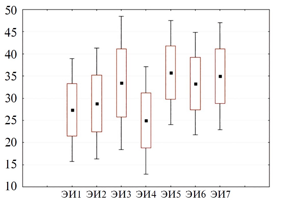 ЭИ1 – позитивная экспрессивность, ЭИ2 – негативная экспрессивность, ЭИ3 – внимание к эмоциям, ЭИ4 – принятие решений на основе эмоций, ЭИ5 – сопереживание радости, ЭИ6 – сопереживание несчастьям и ЭИ7 – эмпатия.