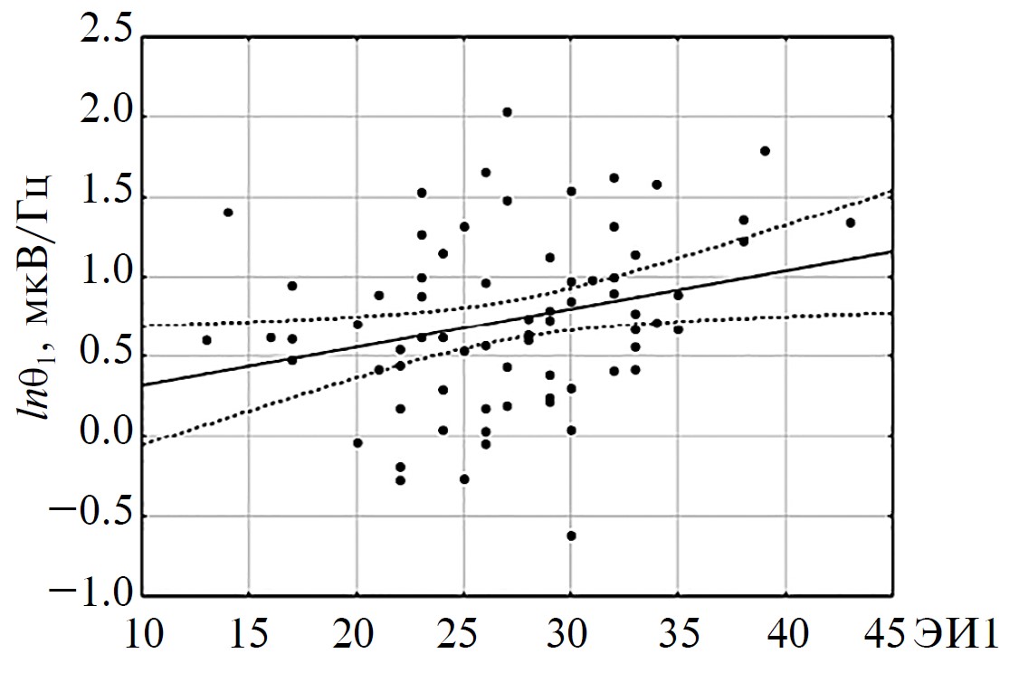 Рис. 3. Взаимосвязь показателей ЭИ1 (позитивная экспрессивность) и мощности θ1-ритма в отведении ТР7.