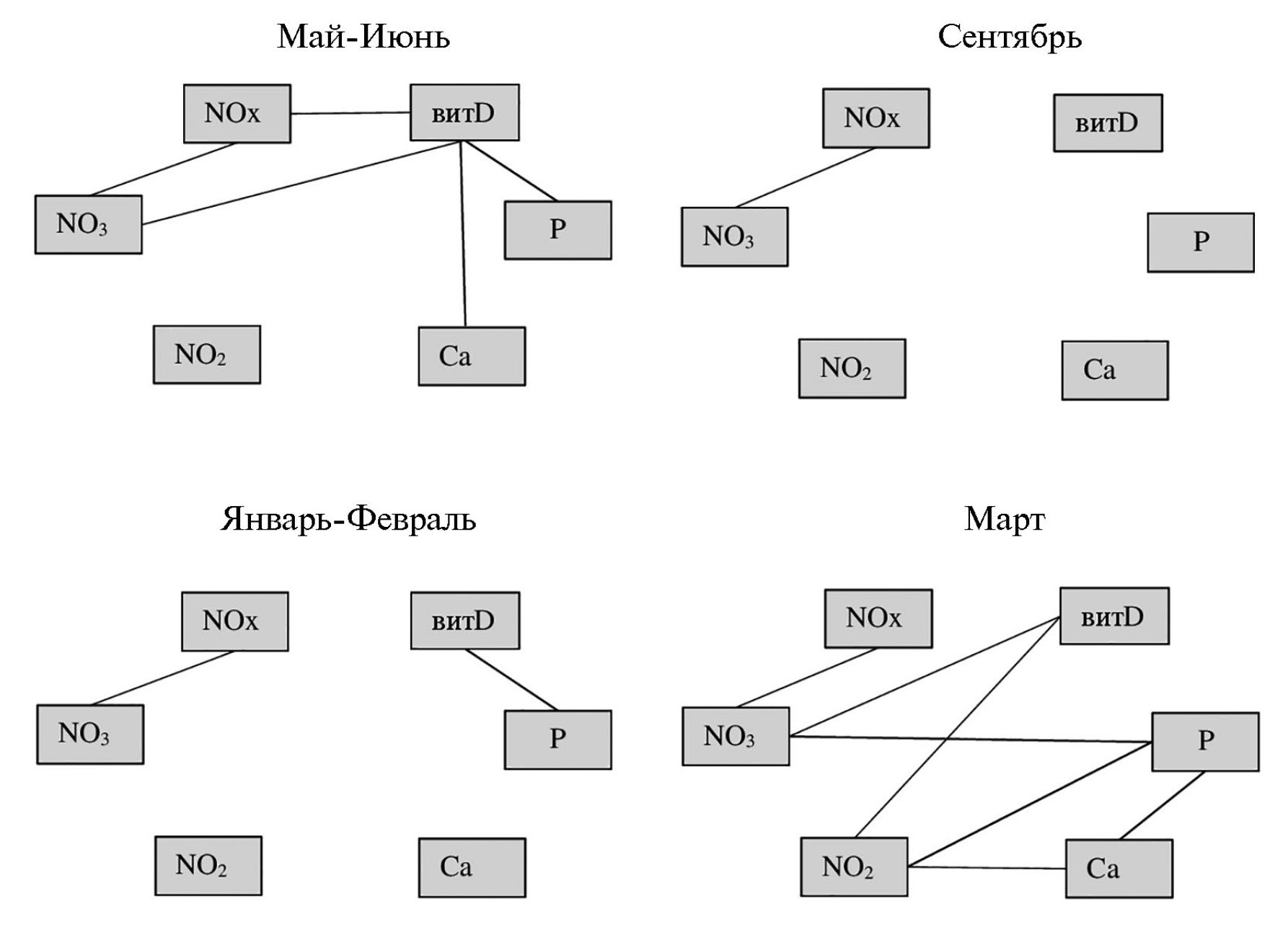 Месяц | Группа | 25(OH)D, нг/мл | NOх, µмоль/л | NO2, µмоль/л | NO3, µмоль/л | Ca, ммоль/л | P, ммоль/л |