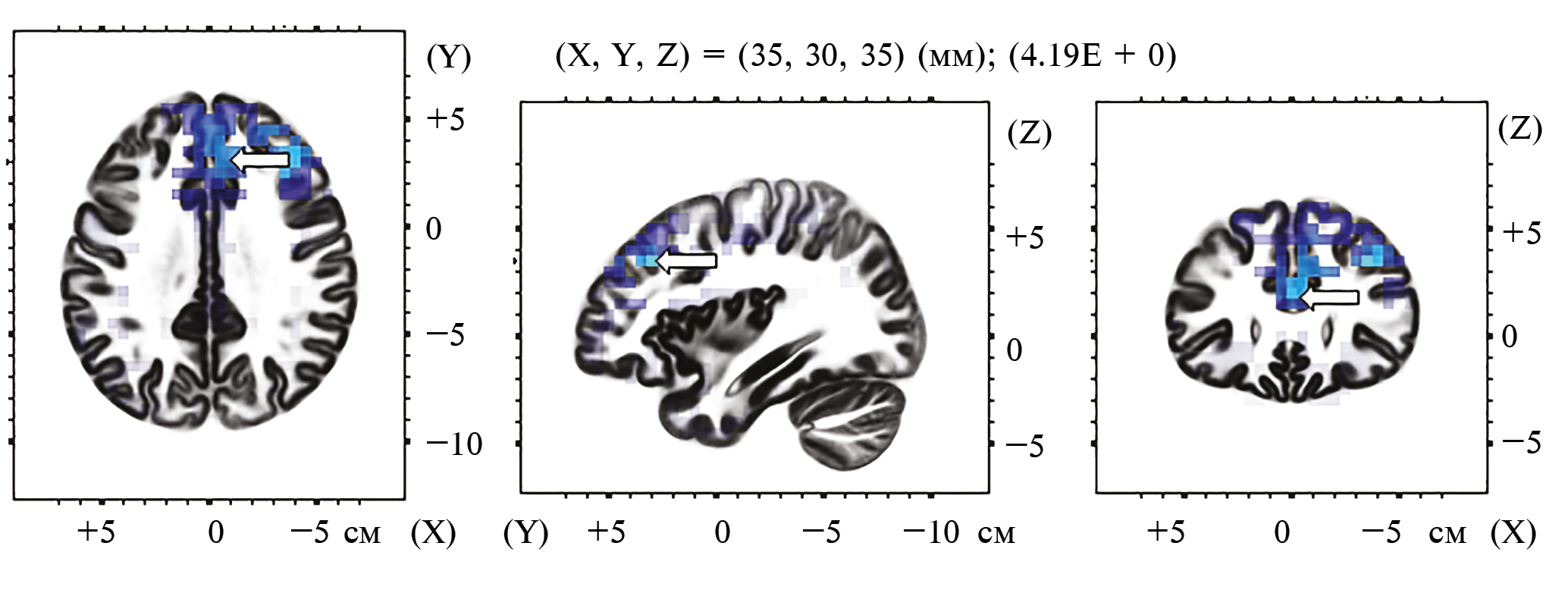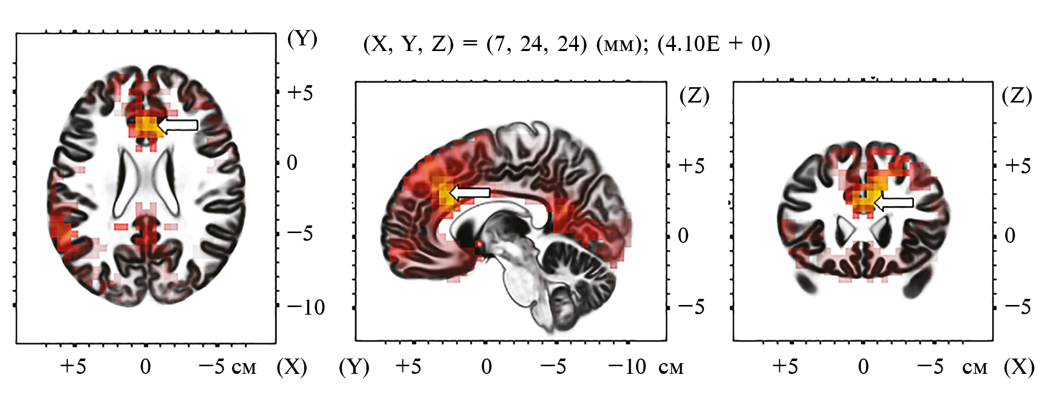 Рис. 2. Результат сравнения источников θ-ритма в условиях кооперации и индивидуального выполнения.