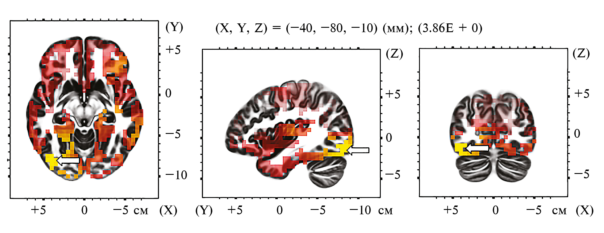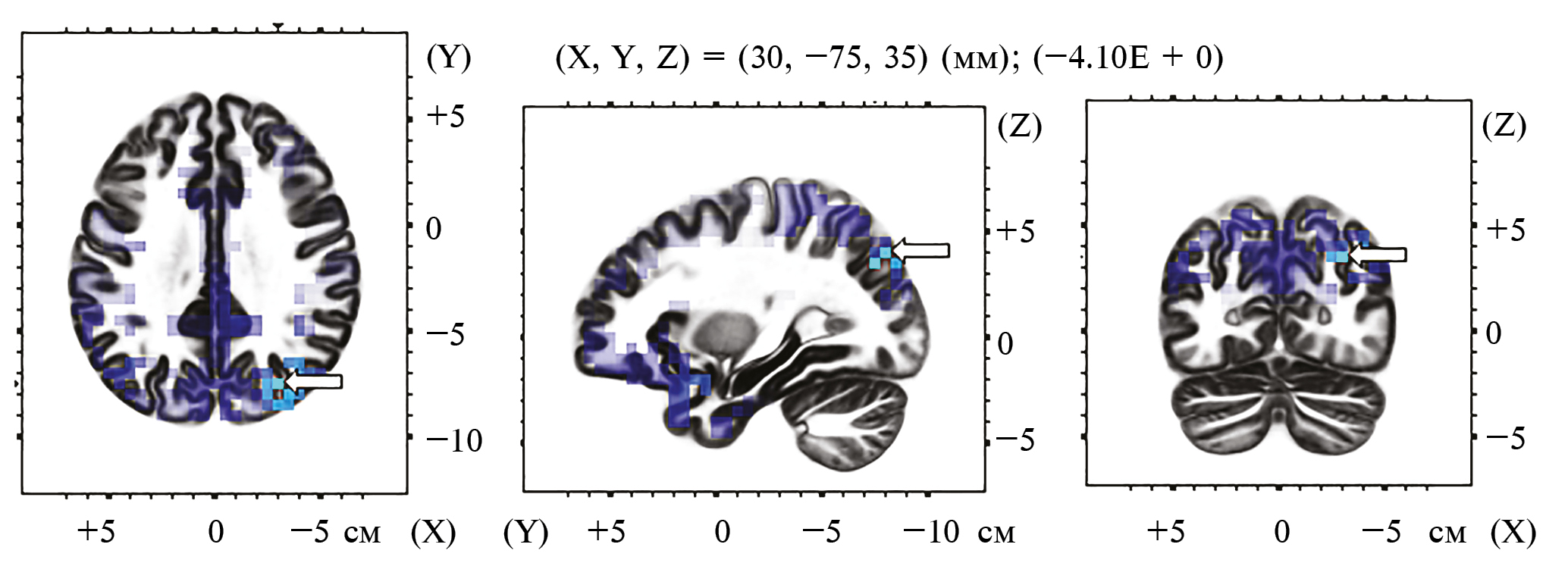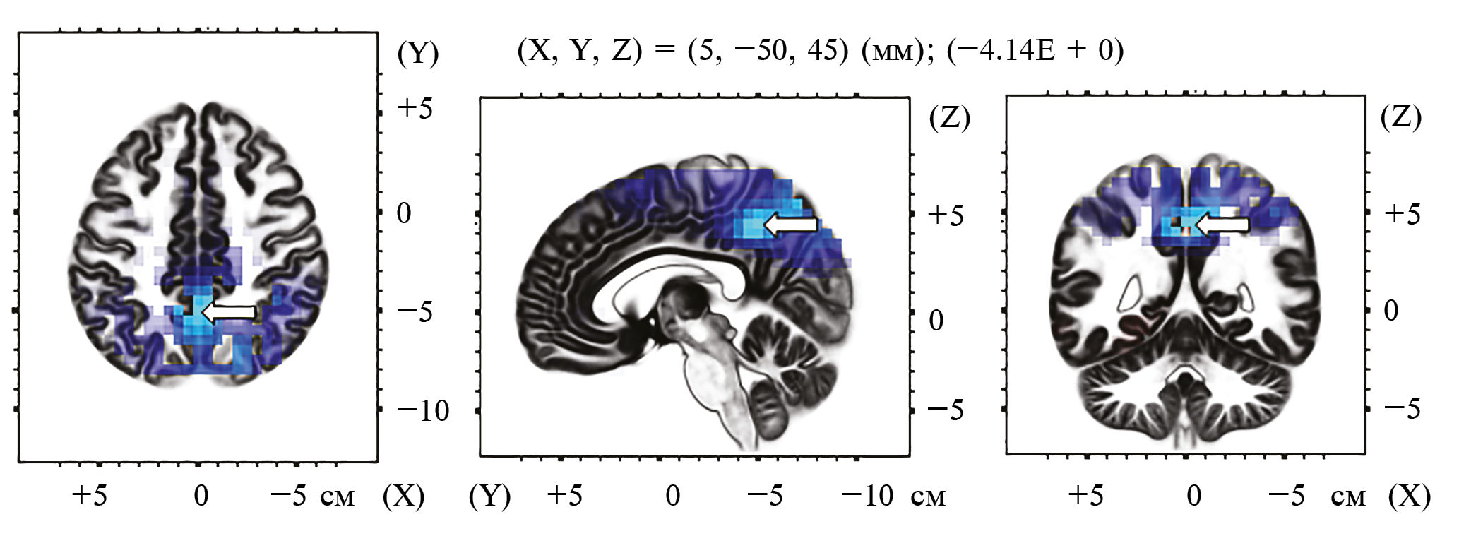 Во время конкуренции спектральная плотность α-частотного диапазона была меньше по сравнению с индивидуальным выполнением в теменных и затылочных областях коры (максимальный эффект был обнаружен в предклинье, область Бродмана 7) (рис. 3).