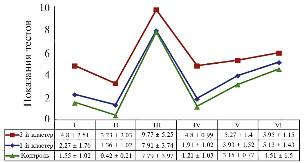 Полученные кластеры пациентов также статистически значимо не различались по социально–демографическим и клиническим показателям (р > 0.05) (табл. 2).
