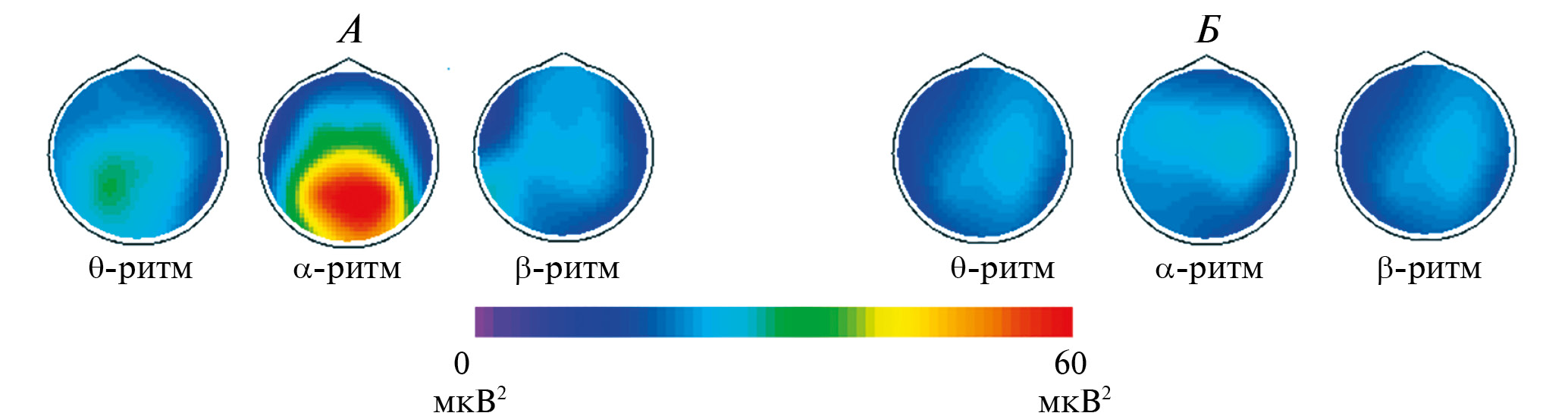 Рис. 2. Топографические карты фоновой спектральной мощности электроэнцефалограммы (ЭЭГ) в 3–частотных диапазонах в группах больных алкогольной зависимостью, вошедших по результатам кластер–анализа в 1–й кластер (А) и 2–й кластер (Б).