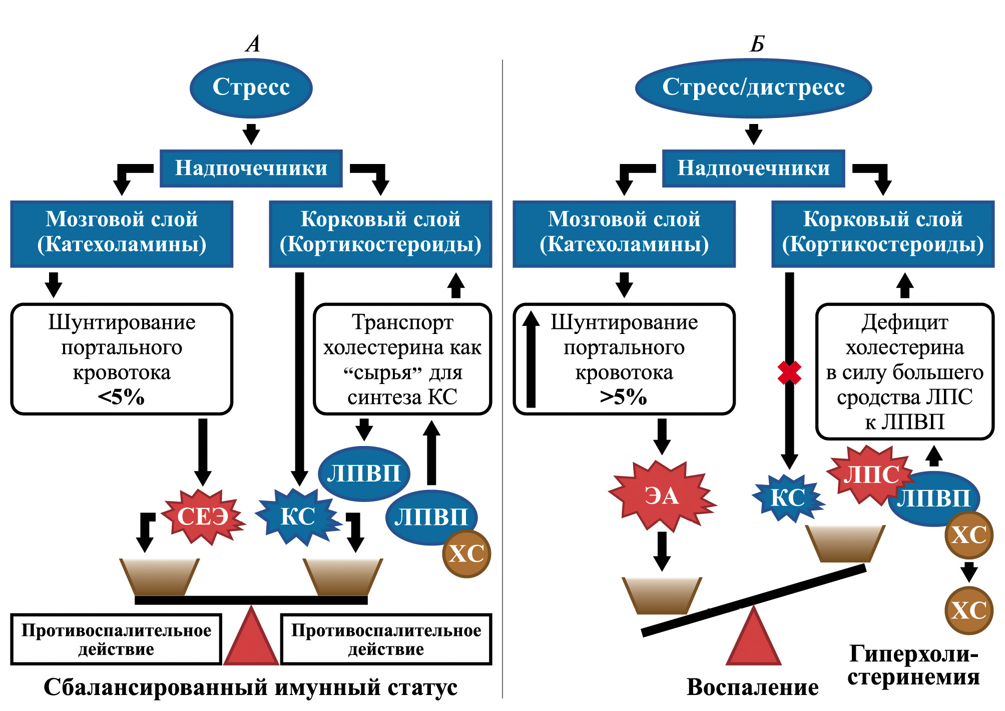 Рис. 2. В условиях системной эндотоксинемии (А) иммунный статус сбалансирован, при эндотоксиновой агрессии (Б) провоспалительный преобладает, поскольку не уравновешивается противоспалительным действием коры надпочечников (по [35] в авторской модификации).