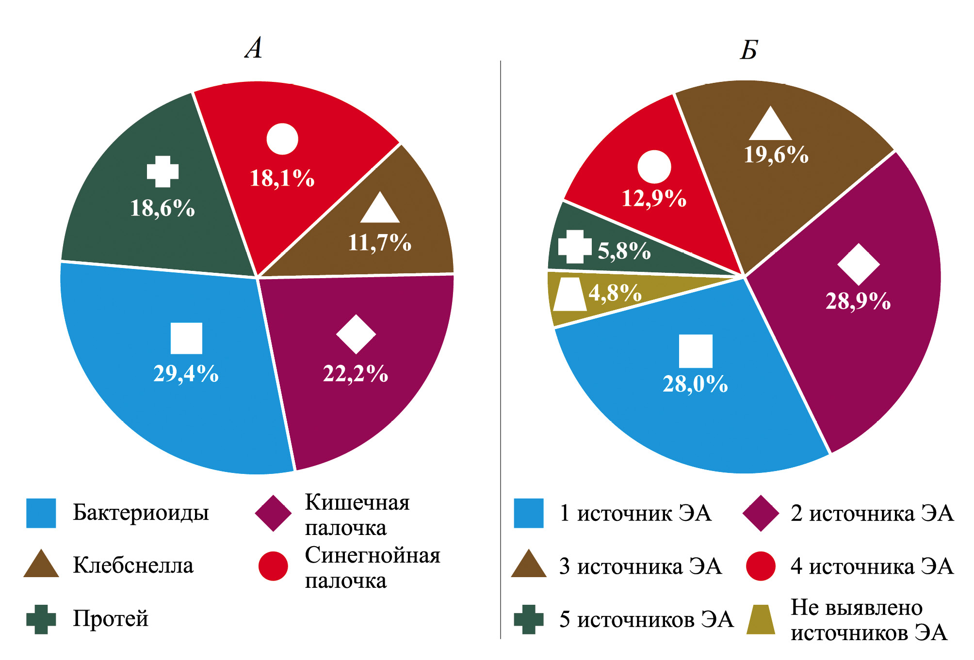 Рис. 3. Процент (А) и число бактерий (Б) формирующих эндотоксиновую агрессию (по [74] в авторской модификации).