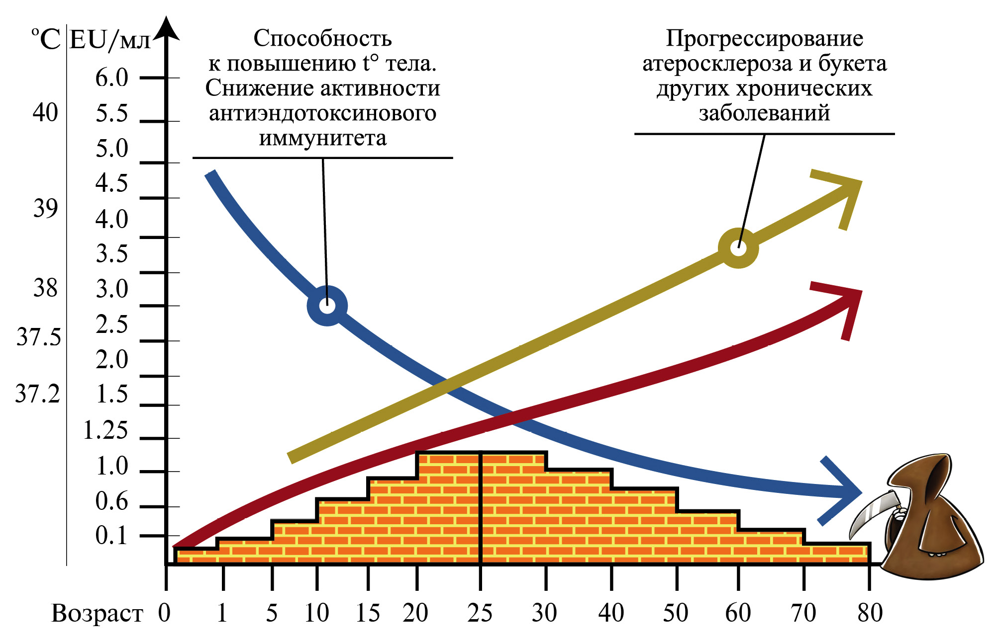 Вполне вероятно, что одной из причин увеличения продолжительности жизни на планете является широкое использование противовоспалительных нестероидных лекарственных препаратов, энтеросорбентов и пищевых добавок с антиоксидантной активностью. Первую успешную попытку замедления процесса старения путем воздействия на МК осуществил И.И. Мечников. Далее была постулирована способность МК в условиях стресса индуцировать воспаление [2], и наконец, выдающийся ученый Клаудио Франчески связал старение с врожденным иммунитетом и низкоинтенсивным воспалением [83, 84], сформулировал воспалительную теорию старения, которая по своей сути не противоречит ни одной ранее существовавшей и более того, их в себя вмещает. Однако введенный им в научную семантику новый термин "inflammaging" ("воспалительное старение") вряд ли можно считать удачным, поскольку не верифицированы какие-либо его отличительные особенности, а сама "воспалительная теория старения" не является завершающей (как это обычно и бывает в науке), поскольку не учитывает роль: перенесенных острых воспалительных заболеваний (наиболее яркий пример: разлитой перитонит существенно сокращает продолжительность жизни [66]) и СЭЕ, а точнее ее патогенной формы — ЭА. Игнорирование (а возможно незнание или недооценка) универсальной роли ЭА в общей патологии обусловило относительную безуспешность поиска маркеров старения, кандидатов в которые слишком велико для создания алгоритма "антивозрастных мероприятий" в клинических условиях. Вполне возможно, что основной причиной этого являлось отсутствие даже рабочей версии определения термину "старение", которому совсем недавно дано следующее определение: "Старение — генетически обусловленный процесс самоуничтожения, реализуемый иммунной системой при участии кишечного эндотоксина и стресса, который характеризуется низкоинтенсивным воспалением и хроническими заболеваниями прогрессирующего течения" [7]. Наш многолетний успешный опыт применения средств снижения концентрации ЛПС в общем кровотоке и повышения активности АЭИ в схеме лечения больных самыми различными хроническими заболеваниями свидетельствует о целесообразности использования интегральных показателей СЭЕ в качестве потенциальных маркеров старения, поиска или верификации средств обладающих геропротективной активностью. Перспективность "антиэндотоксинового направления" в гериатрии и геронтологии подтверждается возрастной динамикой изменения интегральных показателей СЭЕ (рис. 5) [7], и нарастающими проявлениями эндотоксиновой толерантности (утрата способности организма повышать температуру тела в ответ на избыток ЛПС в кровотоке). Быть может она и является патогенетической основой "inflammaging"? Если этот посыл действительно окажется правомерным, то его можно будет квалифицировать как самостоятельную разновидность воспаления, связанного с возрастным снижением способности иммунной системы реагировать на ЛПС.