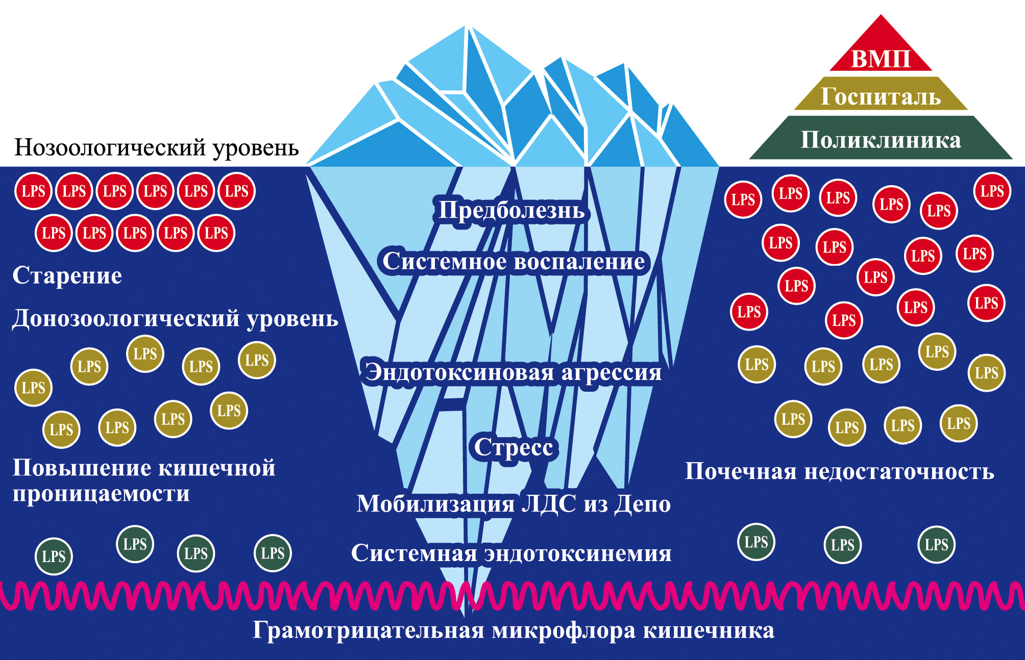 Рис. 6. Универсальная роль эндотоксиновой агрессии общей патологии — в индукции системного воспаления (по [7] в авторской модификации).