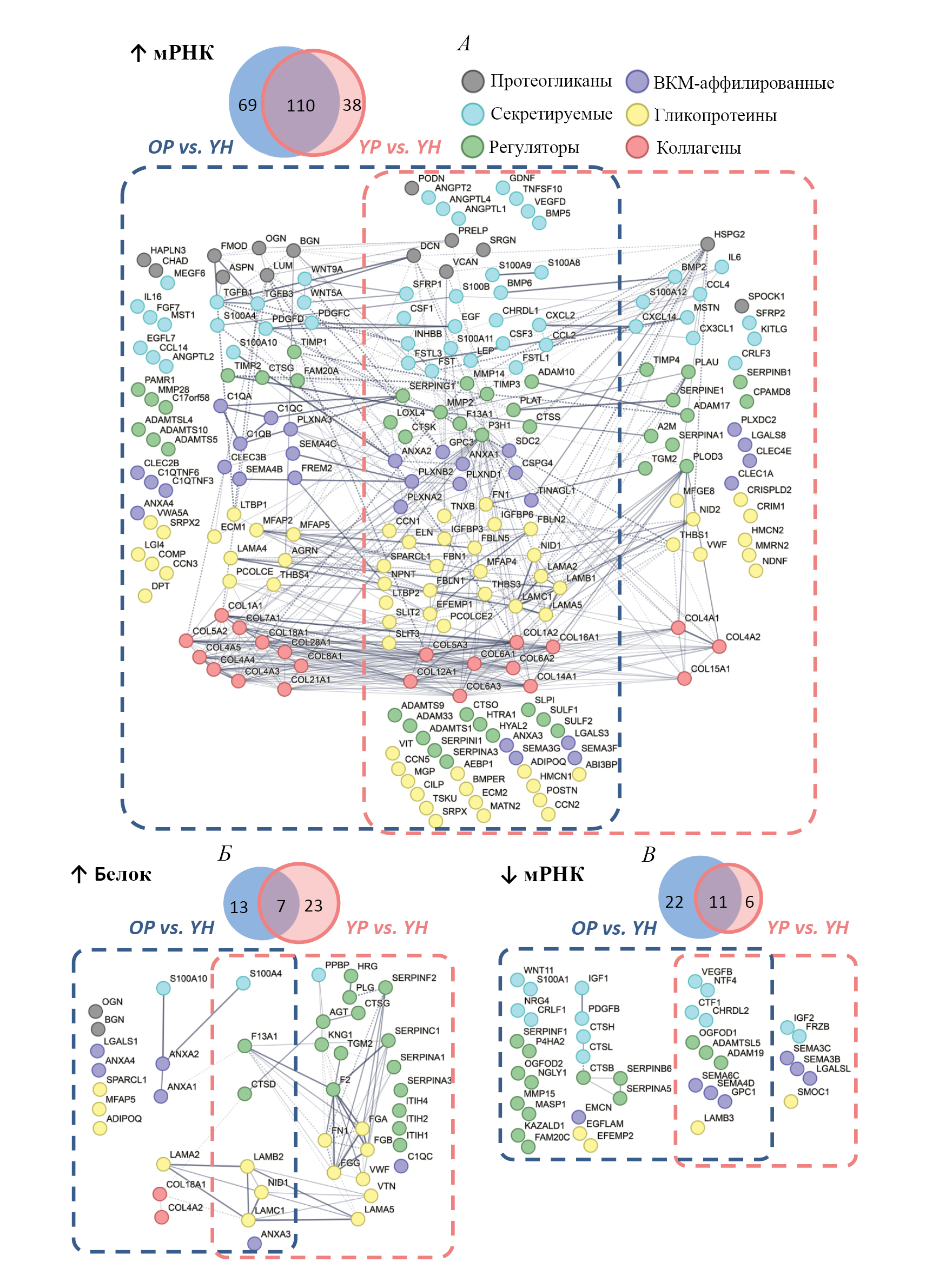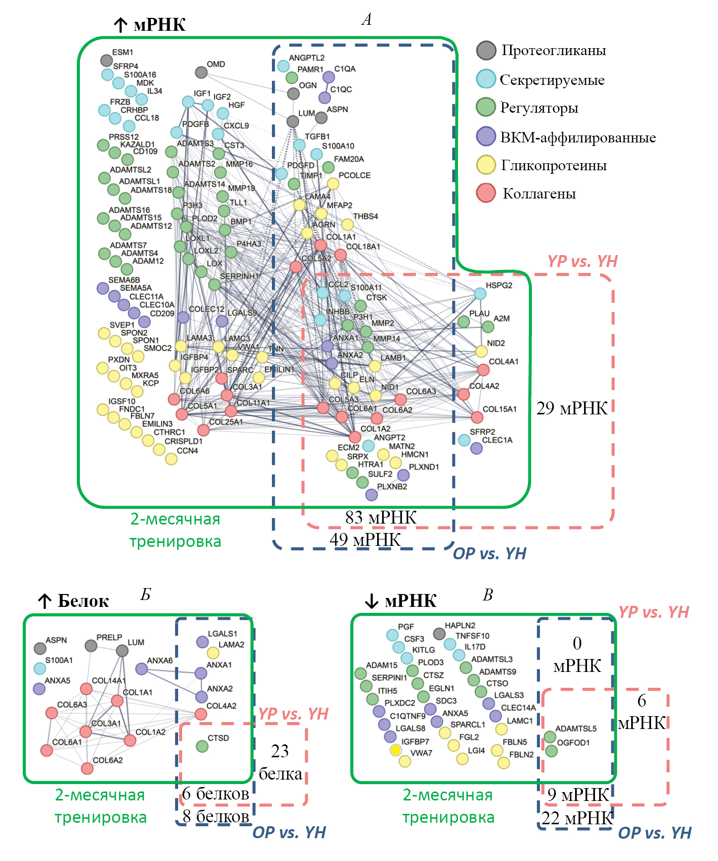 Рис. 3. Изменения экспрессии генов, кодирующих мРНК (padj < 0.01) и белки (padj < 0.05) матрисома, в m. vastus lateralis после 2-месячной аэробной тренировки значительно отличаются от изменений, вызванных хроническим снижением двигательной активности у пожилых (OP vs YH) и молодых людей (YP vs YH). Количество общих и уникальных мРНК (А и В) и белков (Б) показано на пересекающихся и непересекающихся областях диаграмм. Линиями показаны потенциальные белок-белковые взаимодействия; толщина линий пропорциональна релевантности взаимодействия.