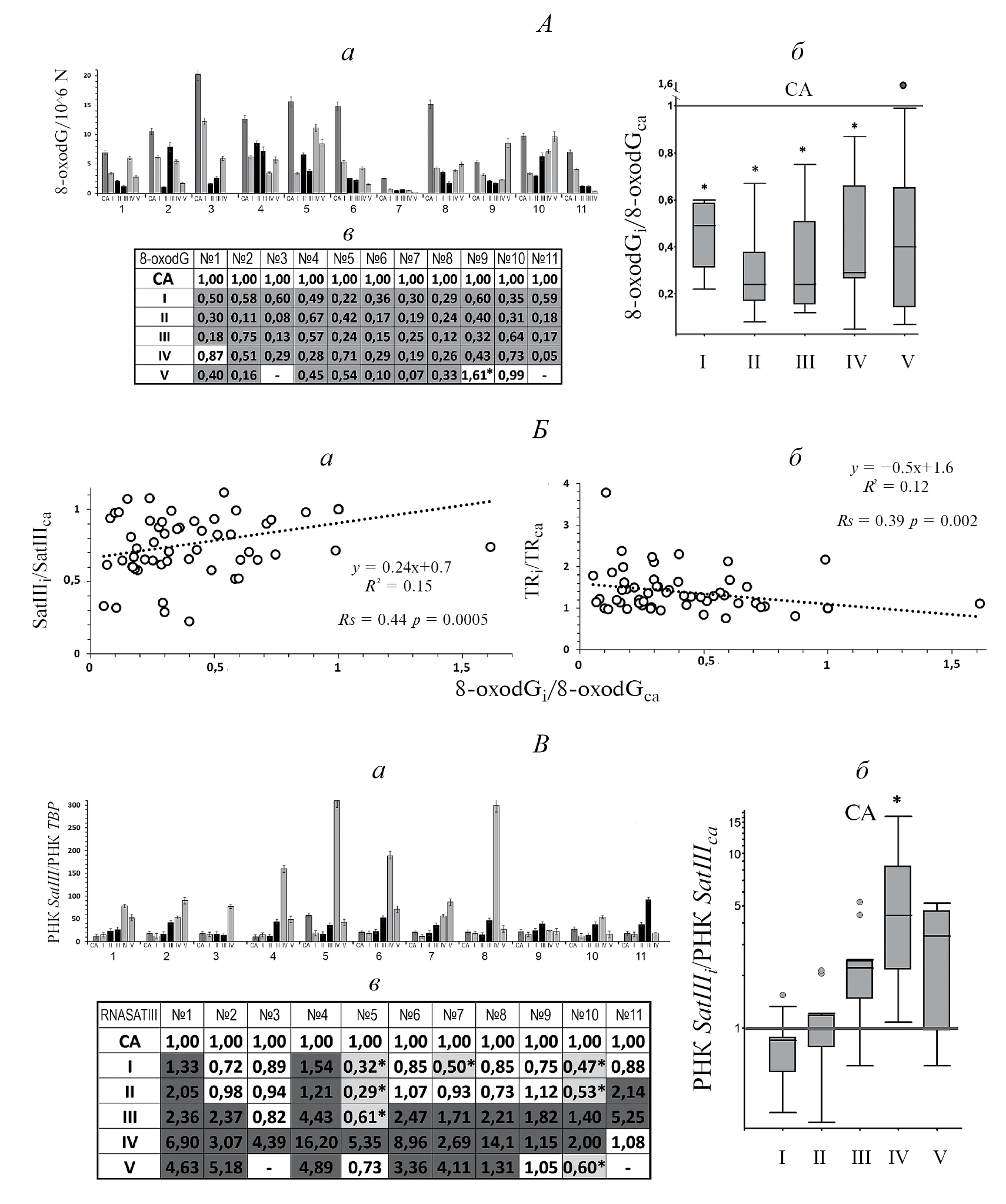 Рис. 3. Повреждения ДНК клеток крови зимовщиков. А – содержание маркера окисления 8-oxodG в образцах ДНК, выделенных из клеток крови каждого зимовщика (а), изменения в содержании 8-oxodG в образцах ДНК в точках I-V по сравнению с контролем (СА) (б), анализ изменений 8-oxodG в условиях работы на станции по сравнению с периодом до прибытия на станцию (в). Б – зависимость изменения содержания SatIII(1q) (а) и содержания TR (б) в ДНК от изменения уровня маркера окисления 8-oxodG. Приводятся данные корреляционного анализа Спирмена (Rs и p). В – содержание РНК SATIII(1q) в образцах РНК, выделенных из клеток крови каждого зимовщика (а), изменения в содержании РНК SATIII(1q) в образцах РНК в точках I–V, по сравнению с контролем (СА) (б), анализ изменений содержания РНК SATIII(1q) в условиях работы на станции по сравнению с периодом до прибытия на станцию (в). На графиках A, a и В, а приводятся средние значения для трех измерений и ошибка измерения (SE). Темно-серый цвет столбиков – пробы крови получены до прибытия на станцию (проба СА), светло-серый цвет – пробы, полученные в период полярного дня, черный цвет – пробы, полученные в период полярной ночи. На графиках А, б и В, б точки I–IV: N = 11 образцов; V: N = 9, * – содержание повторов в группе I–V отличается от содержания в контрольной группе (p < 0.01). Белый цвет в таблицах (А, в и В, в) – значение параметра не изменилось (p > 0.05, U-test); темный – повышалось; * обозначены пробы, в которых параметр снижался.