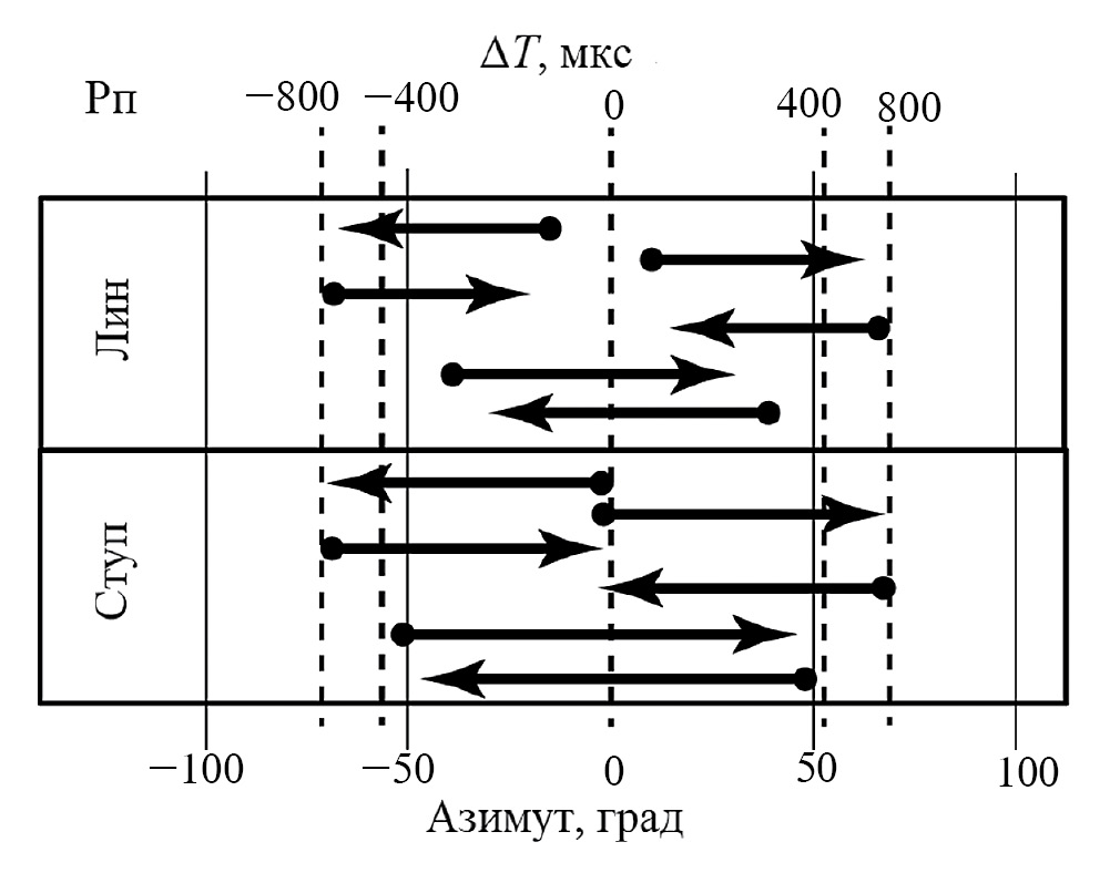 Рис. 2. Воспринимаемые траектории движущихся стимулов (стрелки) и локализация реперов с ΔТ = ±800, ±400 и 0 мкс (пунктирные линии). Острый конец стрелки показывает локализацию точки поворота, тупой конец – локализацию точки старта. Шкала внизу – азимутальный угол в градусах. Отрицательные значения азимута соответствуют левой половине субъективного акустического пространства, положительные – правого