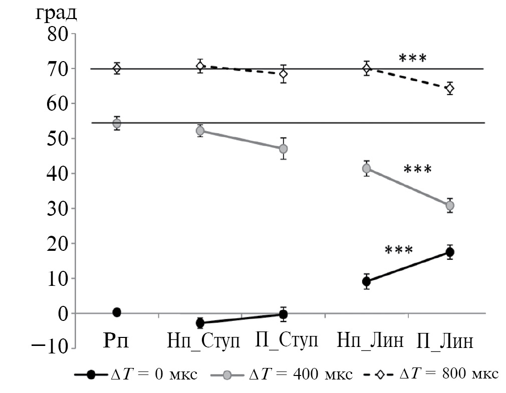 Сравнения Нп_Лин и Нп_Ступ с Рп показывают смещение воспринимаемого положения точек старта относительно положения репера. Сравнения П_Лин и П_Ступ с Рп показывают смещение воспринимаемого положения точек поворота относительно репера. В случае линейного изменения ΔТ, Нп_Лин отличается от Рп при ΔТ = 0 и 400 мкс (p < 0.05 и p < 0.001), а П_Лин – при ΔТ = 0, 400 и 800 мкс (p < 0.001) (рис. 3). При мгновенном изменении ΔТ ни Нп_Ступ, ни П_Ступ не отличаются от соответствующих реперов (p > 0.05).