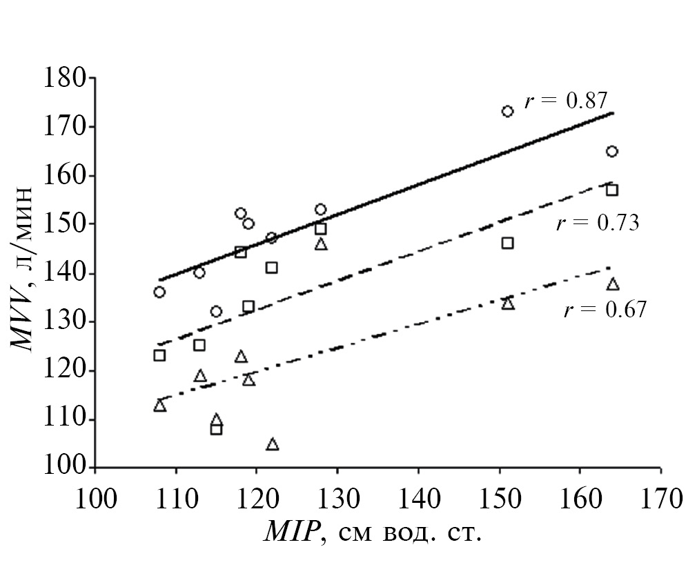 Рис. 1. Корреляционная зависимость между максимальным инспираторным давлением (MIP) и максимальной произвольной вентиляцией легких (MVV) у здоровых добровольцев в контроле при отсутствии дополнительной весовой нагрузки (кружки и сплошная линия тренда), при действии защитного жилета (квадраты и штриховая линия) и сочетании жилета и рюкзака (треугольники и пунктирная линия). Коэффициенты корреляции (r) указаны рядом с линией тренда