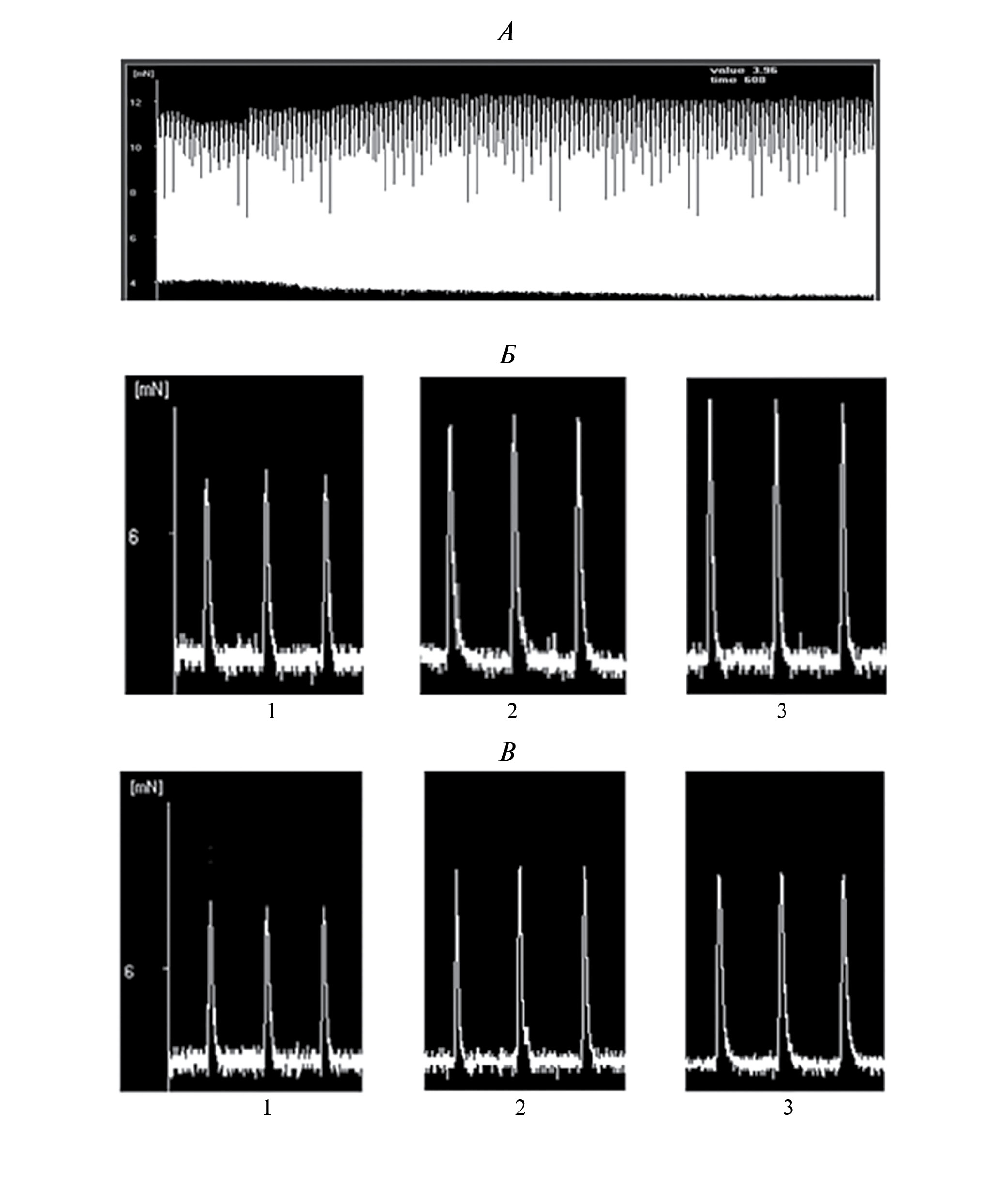 Рис. 1. Типичный вид непрерывной регистрации механограммы мышечных полосок из миокарда ушка правого предсердия человека, отражающей развитие инотропного ответа при воздействии агониста β1-АР (А), а также одиночных циклов “сокращение-расслабления” у пациентов с сохраненной (Б) и низкой (В) фракцией выброса. 1 – до воздействия агониста β1-АР; 2 – через 1 мин после воздействия агониста β1-АР; 3 – через 20 мин после воздействия агониста β1-АР