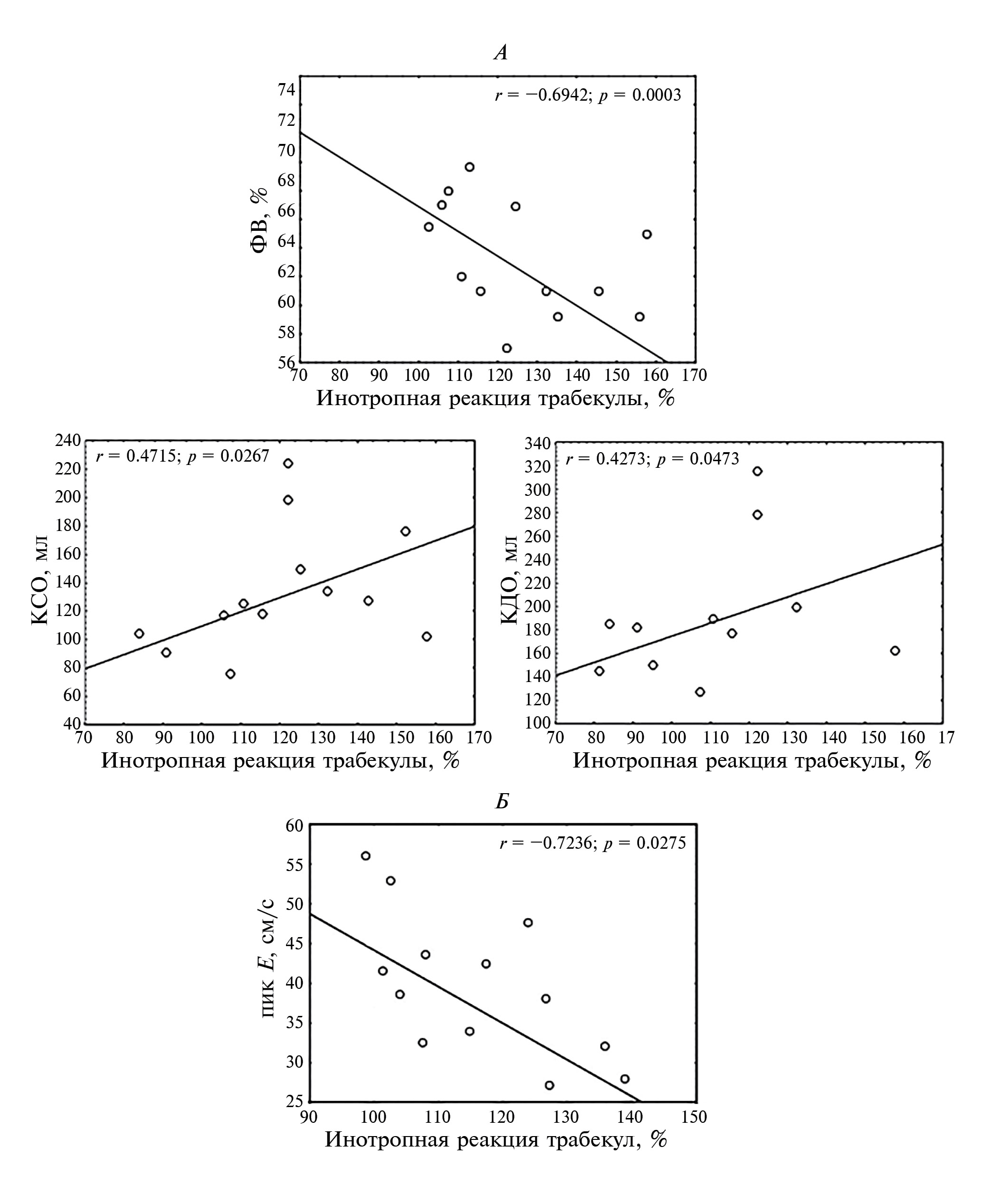 Рис. 2. Корреляционные связи, обнаруженные у пациентов с сохраненной ФВ, между инотропным ответом мышечных полосок через 1 (А) и через 20 (Б) мин после стимуляции β1-АР с результатами ЭхоКГ исследования их сердца. ФВ – фракция выброса (%); КСО – конечный систолический объем (мл); КДО – конечный диастолический объем (мл), пик Е – скорость раннего диастолического наполнения ЛЖ (см/с); пик А – скорость позднего диастолического наполнения ЛЖ (см/с)