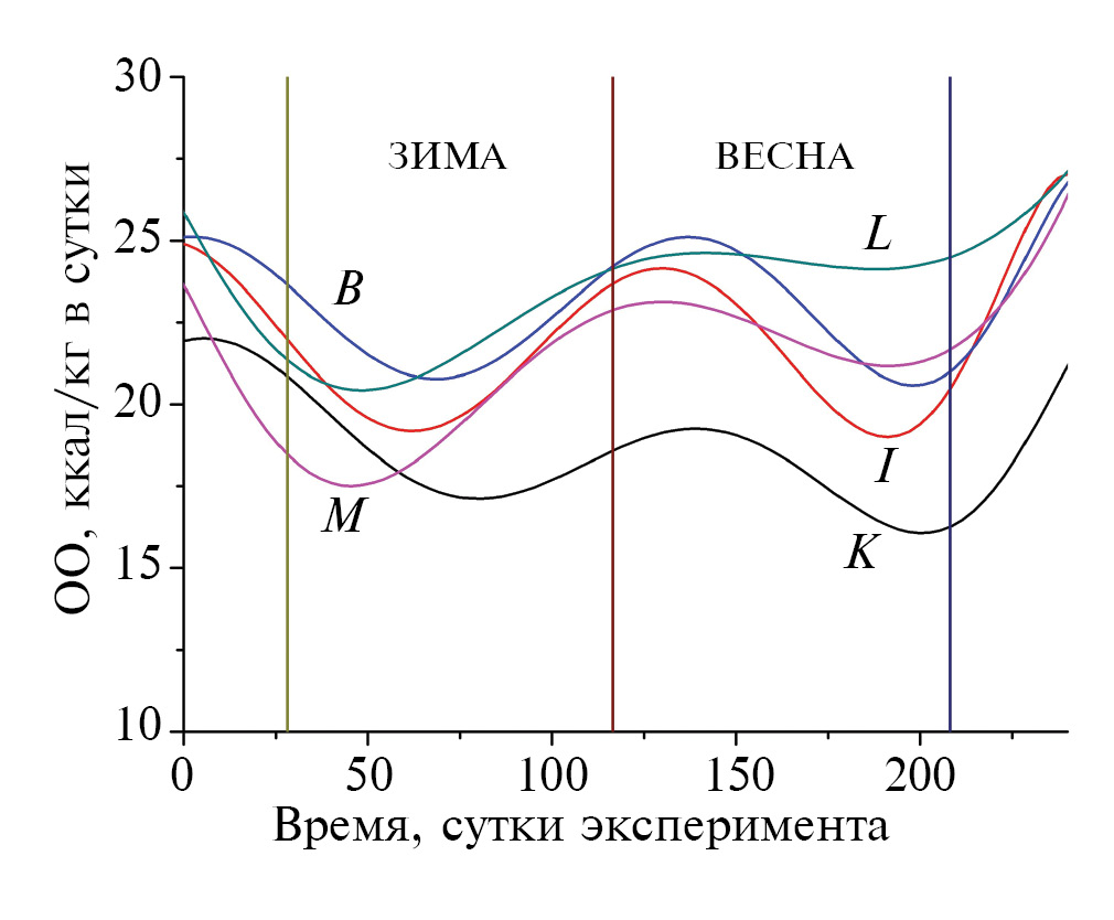 Известно, что у человека в естественных геофизических условиях происходят сезонные изменения ОО, которые заключаются в повышении уровня энерготрат весной и ранним летом и понижении их поздней осенью и зимой [5, 7]. Это связано не столько с температурным фактором, сколько с изменением двигательной активности и колебаниями гормональной деятельности организма в соответствии с биологическими ритмами [25, 26]. Ранее, в 520-суточном изоляционном эксперименте “Марс-520” Государственного научного центра РФ – Института медико-биологических проблем РАН (ГНЦ РФ – ИМБП РАН, г. Москва) с помощью стохастического моделирования вегетативного индекса Кердо (ВИК) нами были обнаружены индивидуальные сезонные ритмы вегетативной регуляции центральной гемодинамики, а также найдены корреляции (r > 0.92, p ≤ 0.05) между величиной ВИК и потреблением кислорода при дозированной физической работе возрастающей мощности [27]. В случае сохранения сезонных колебаний основного энергетического обмена в условиях длительной изоляции от действия геофизических факторов в герметичном объекте следует оценить количественно и учесть эти изменения при расчетах калорийности запасов продуктов питания и кислородсодержащих соединений, необходимых для экипажей, а также в целях оптимизации работы систем управления тепловым режимом КЛА при длительных космических миссиях [28].